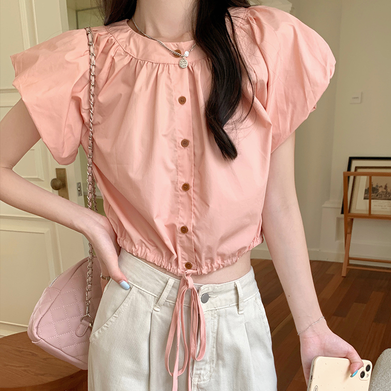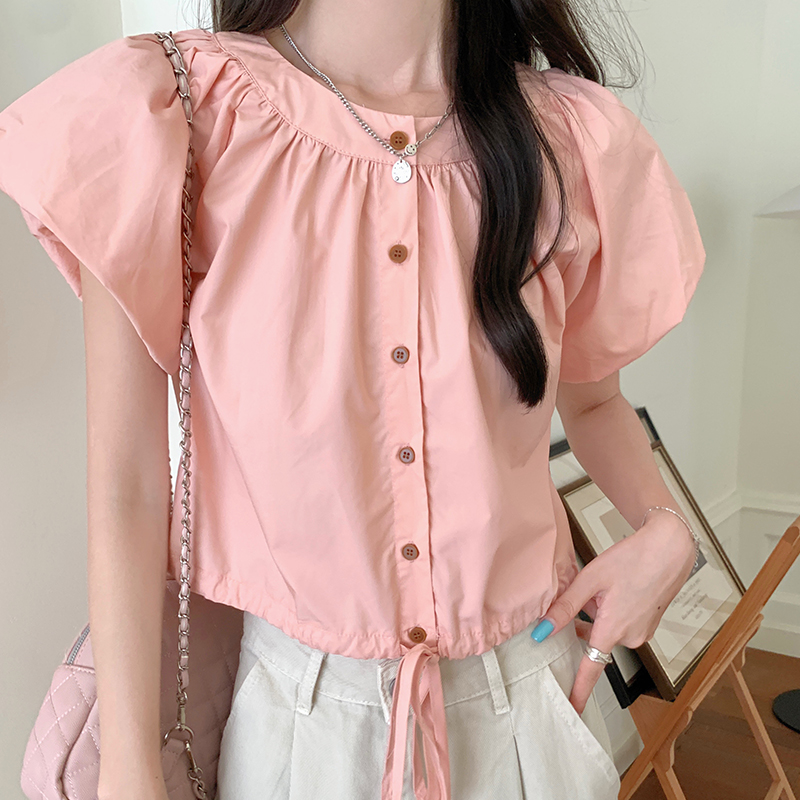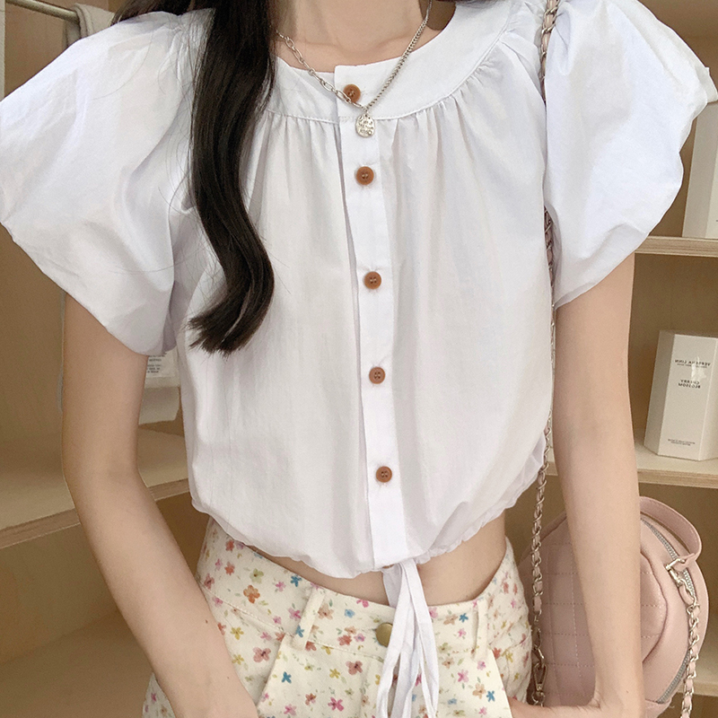 실제 가격#드로우 스트링 허리 껴안는 여성 여름을위한 짧은 슬리브 셔츠 2025 새로운 슬림 짧은 탑 퍼프 슬리브 셔츠