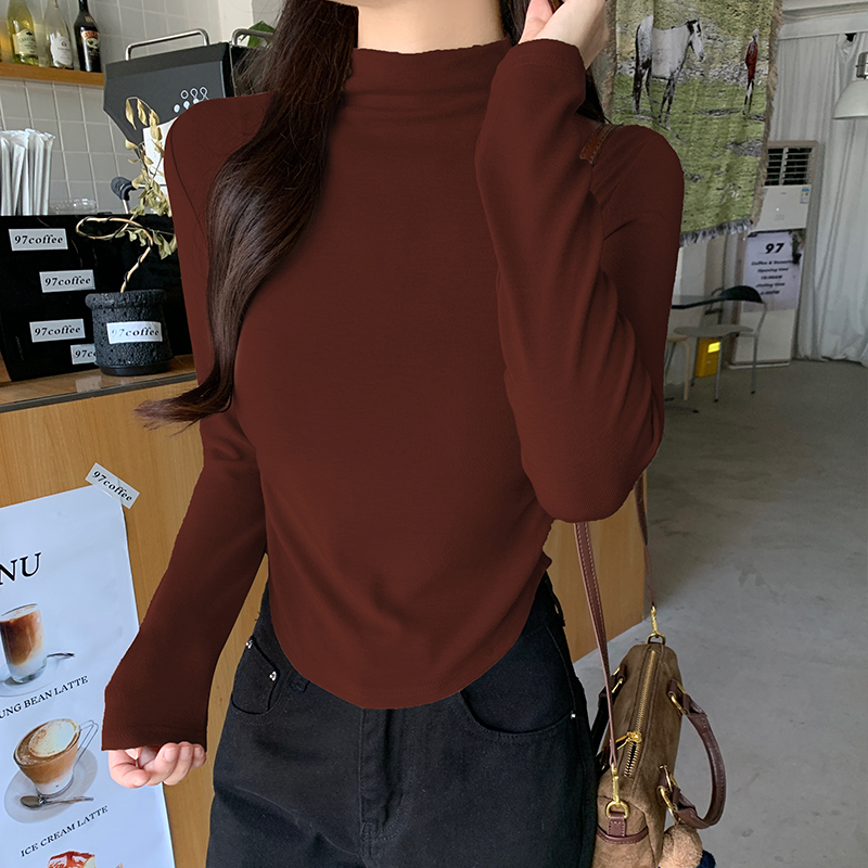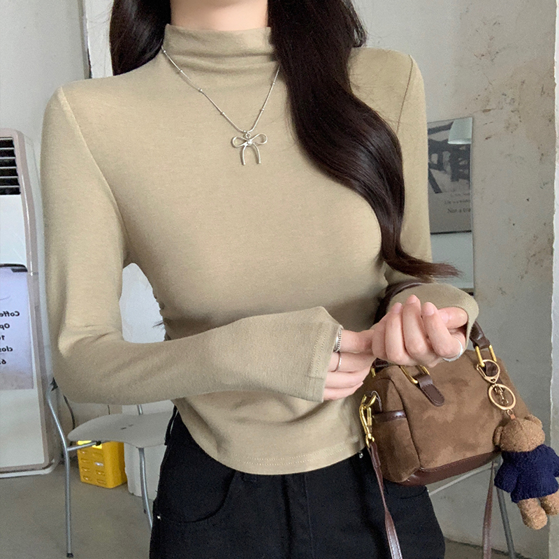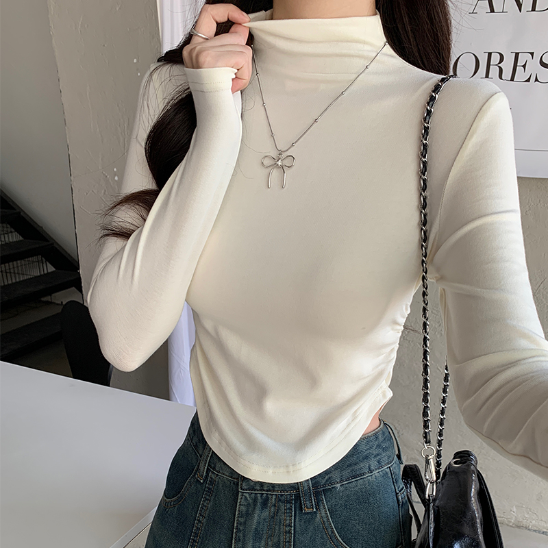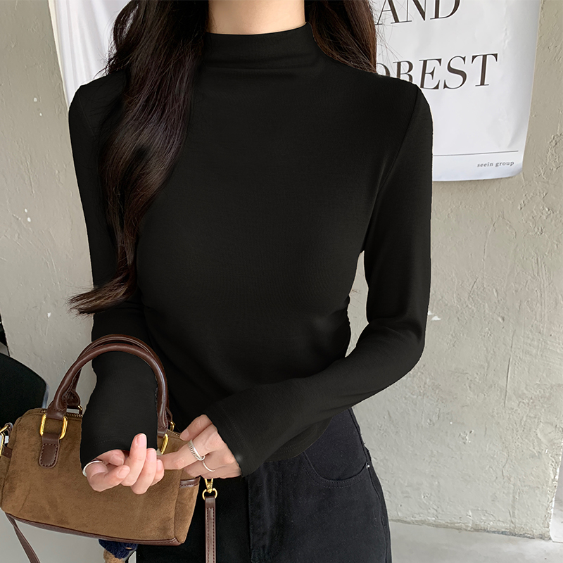 여성을위한 단색 다목적 반 높이 넥베이스 셔츠 티셔츠 겨울 한국 스타일 슬림 핏 주름 내부 단순함 탑 트렌디
