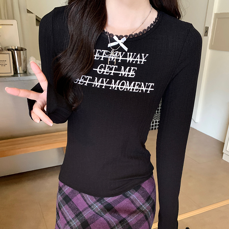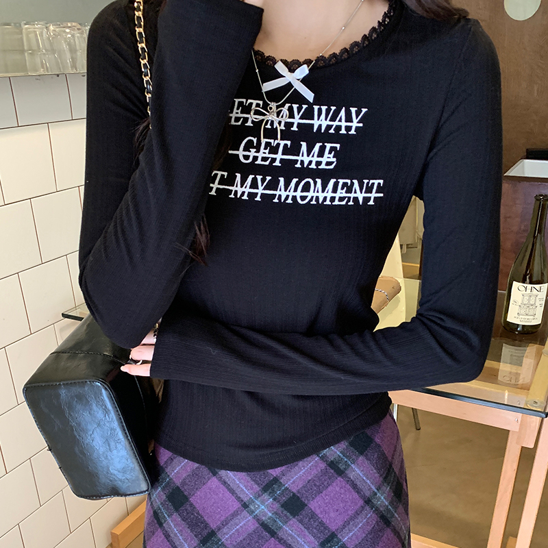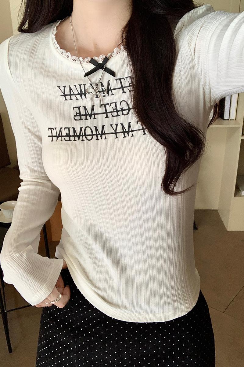 프린트와 레이스 가장자리 디테일이 포인트인 긴팔 티셔츠. 가을 시즌 이너로 활용하기 좋은 여성스러운 아이템입니다.
