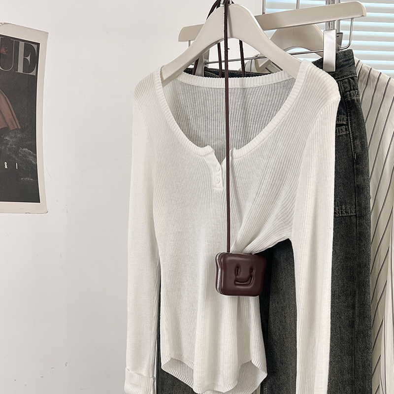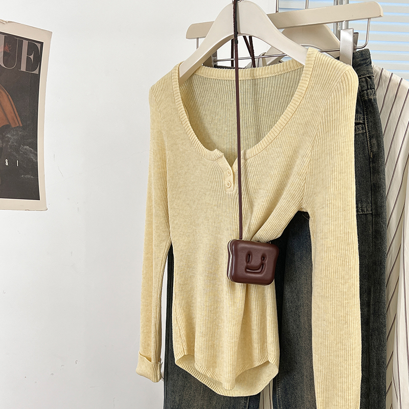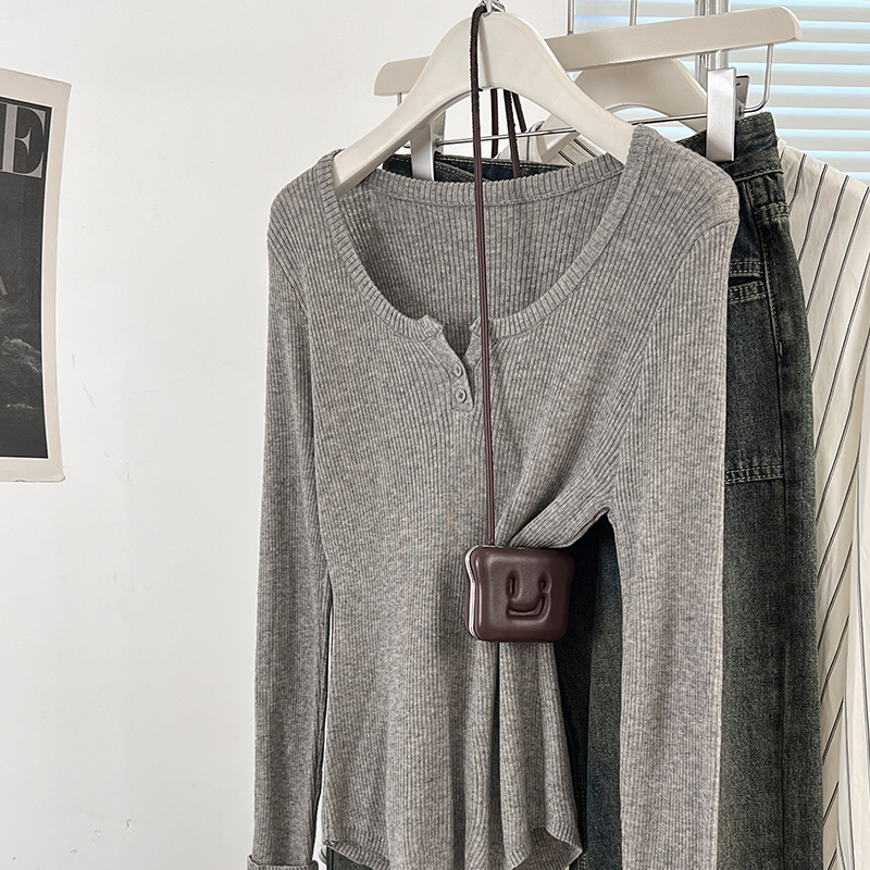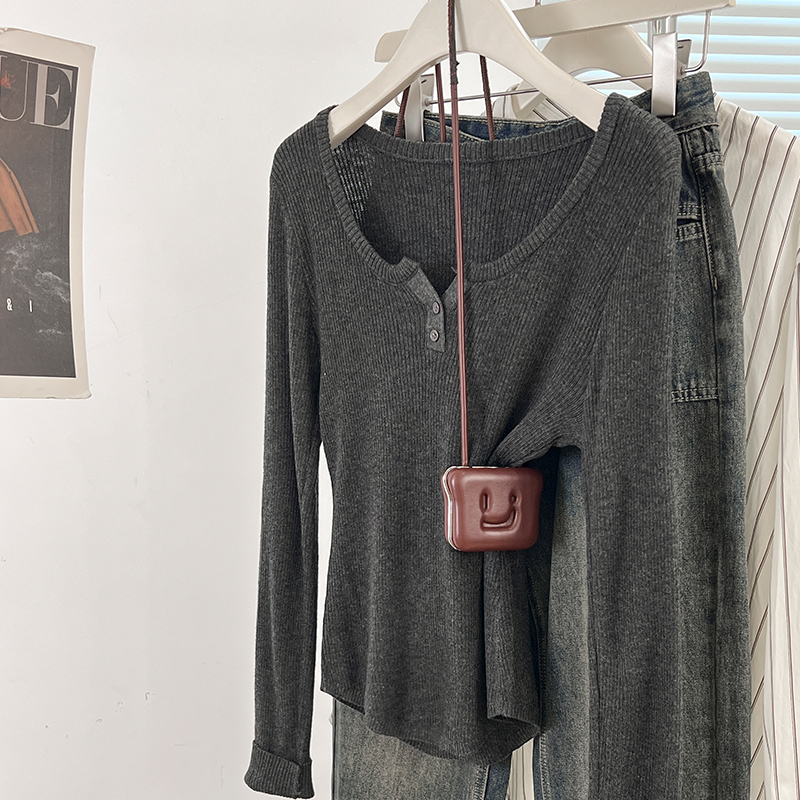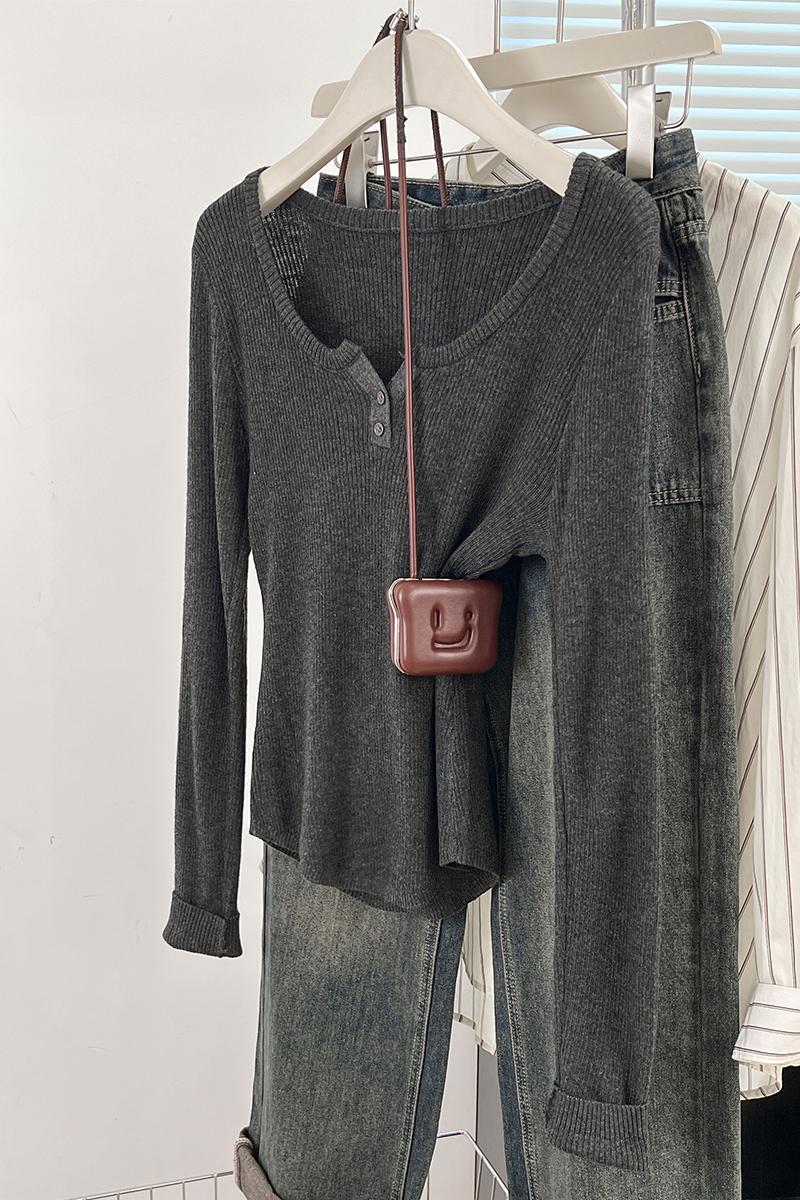 Real-Price Real Shot #Grey v-Neck 전면 봄과 가을 슬림 바닥 셔츠에서 여성을위한 긴팔 스웨터
