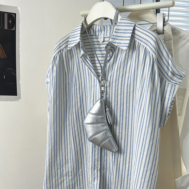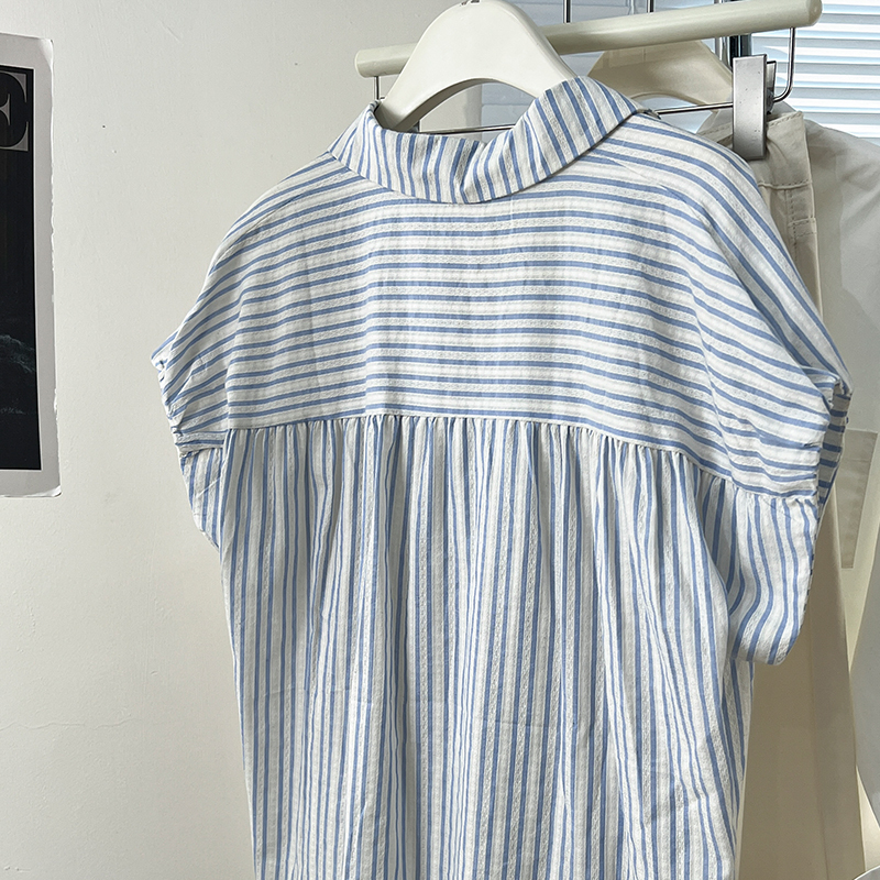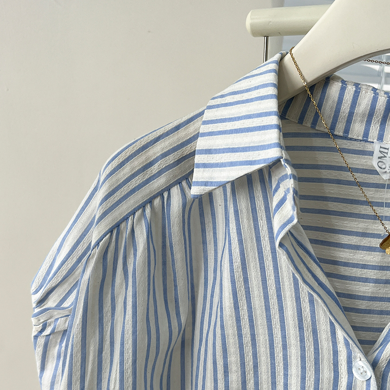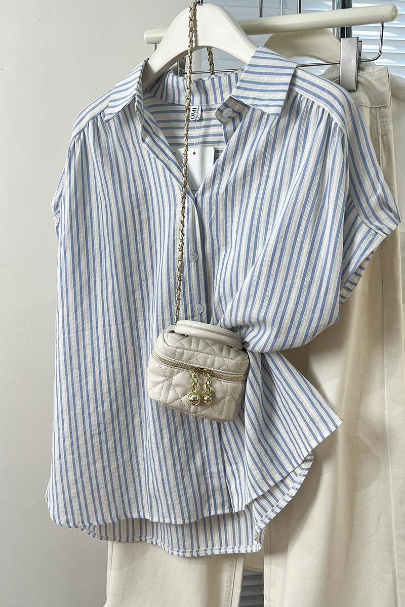 실제 가격 실제 샷 #Blue 수직 줄무늬 짧은 슬리 셔츠 여름 프랑스어 작은 셔츠 캐주얼 느슨한 탑