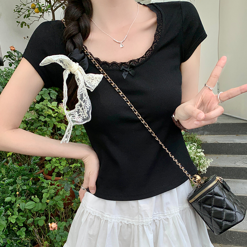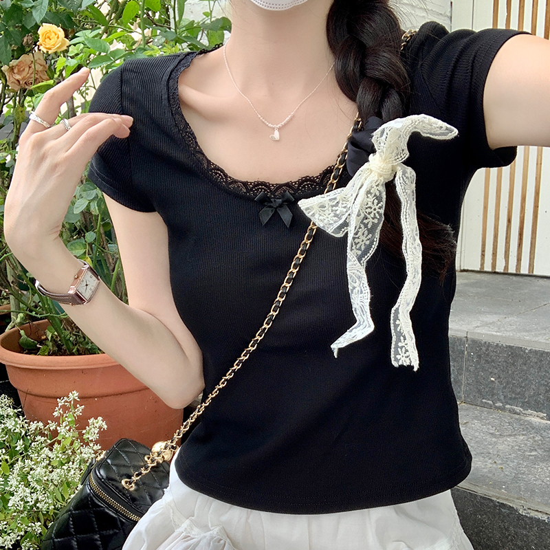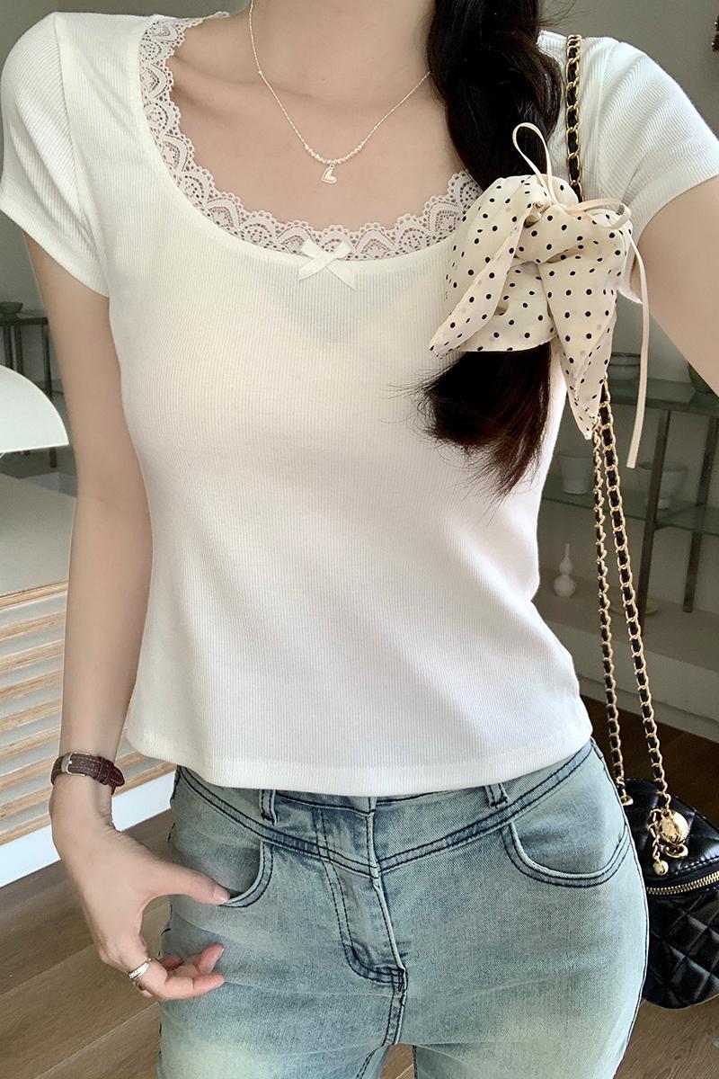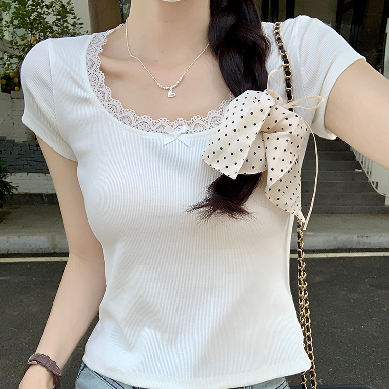 White Lace U-Neck Short-Sleeved T-Shirt for Women New Summer Bow Short Top