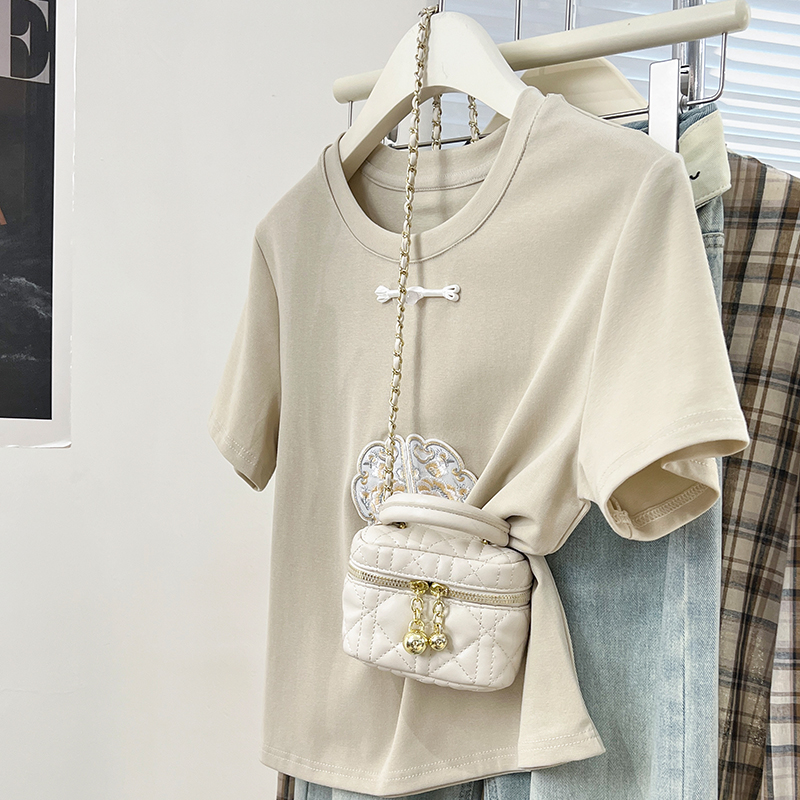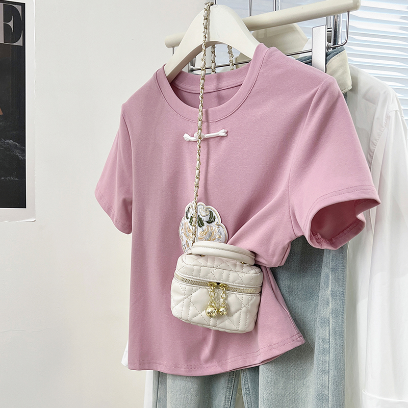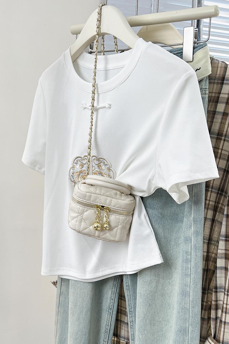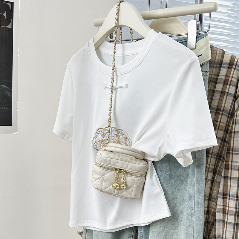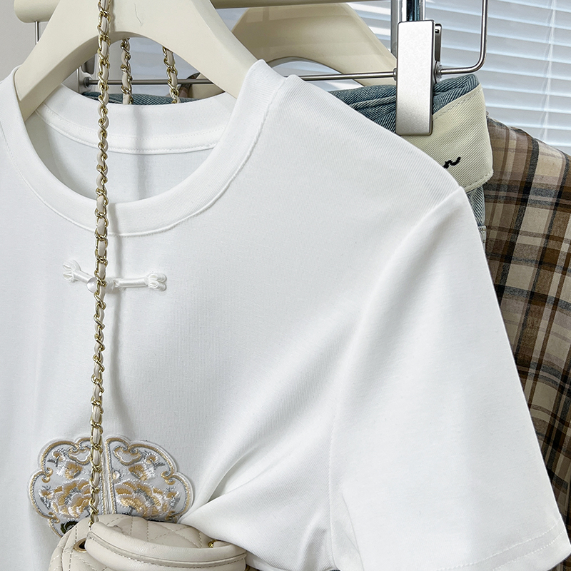 Real-Price Real-Life Shot #New 중국 스타일 자수 순수면 앞쪽 어깨 흰색 짧은 슬리브 티셔츠 여성 여름 짧은 탑
