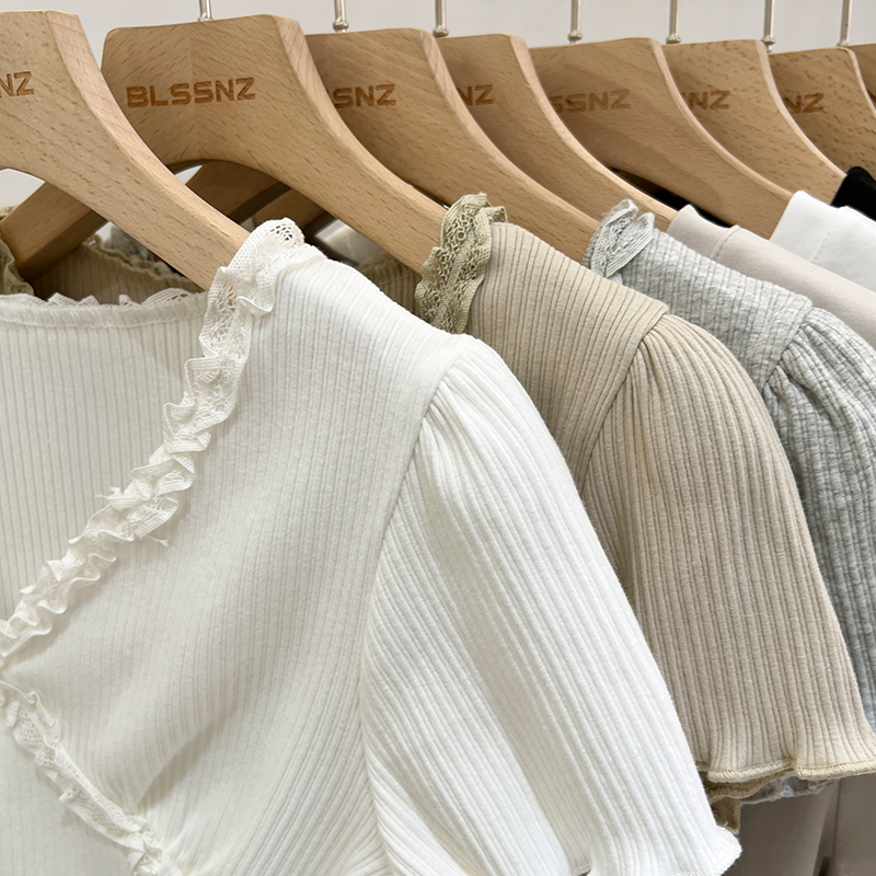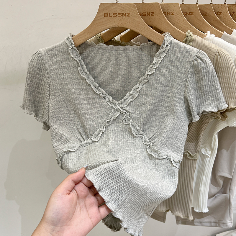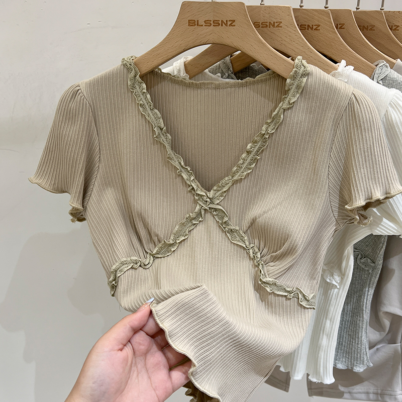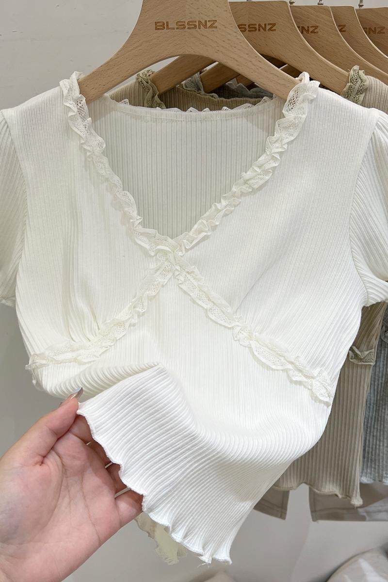 실제 가격 실제 샷 #화이트 레이스 검은 귀 v- 넥 전면 어깨 짧은 슬리브 티셔츠 여름에 여성을위한 작은 짧은 상단