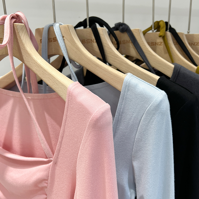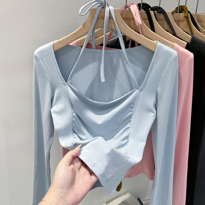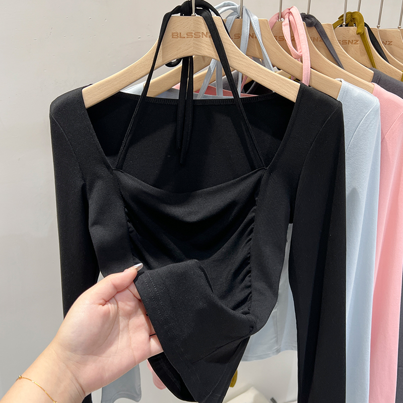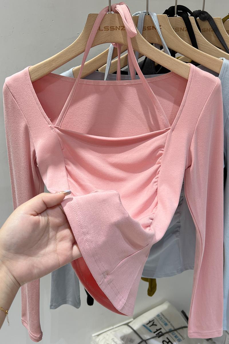 Real Price Real Shot #pink 레이스 업 홀터 목 접이식 사각형 칼라 긴 소매 티셔츠 여자 봄과 가을베이스 셔츠 짧은 탑