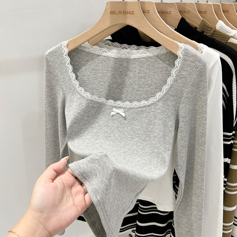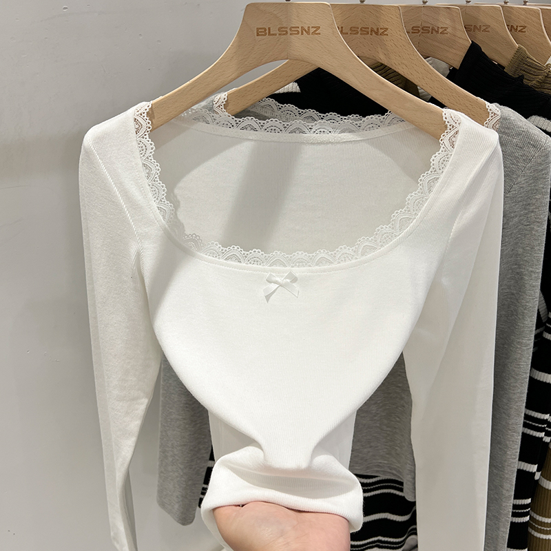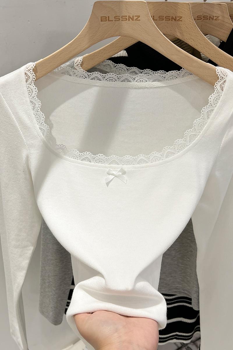 실제 가격 실제 샷 #화이트 보우 레이스 프론트 어깨 스퀘어 칼라 여성용 봄과 가을베이스 셔츠 속옷을위한 긴 소매 티셔츠