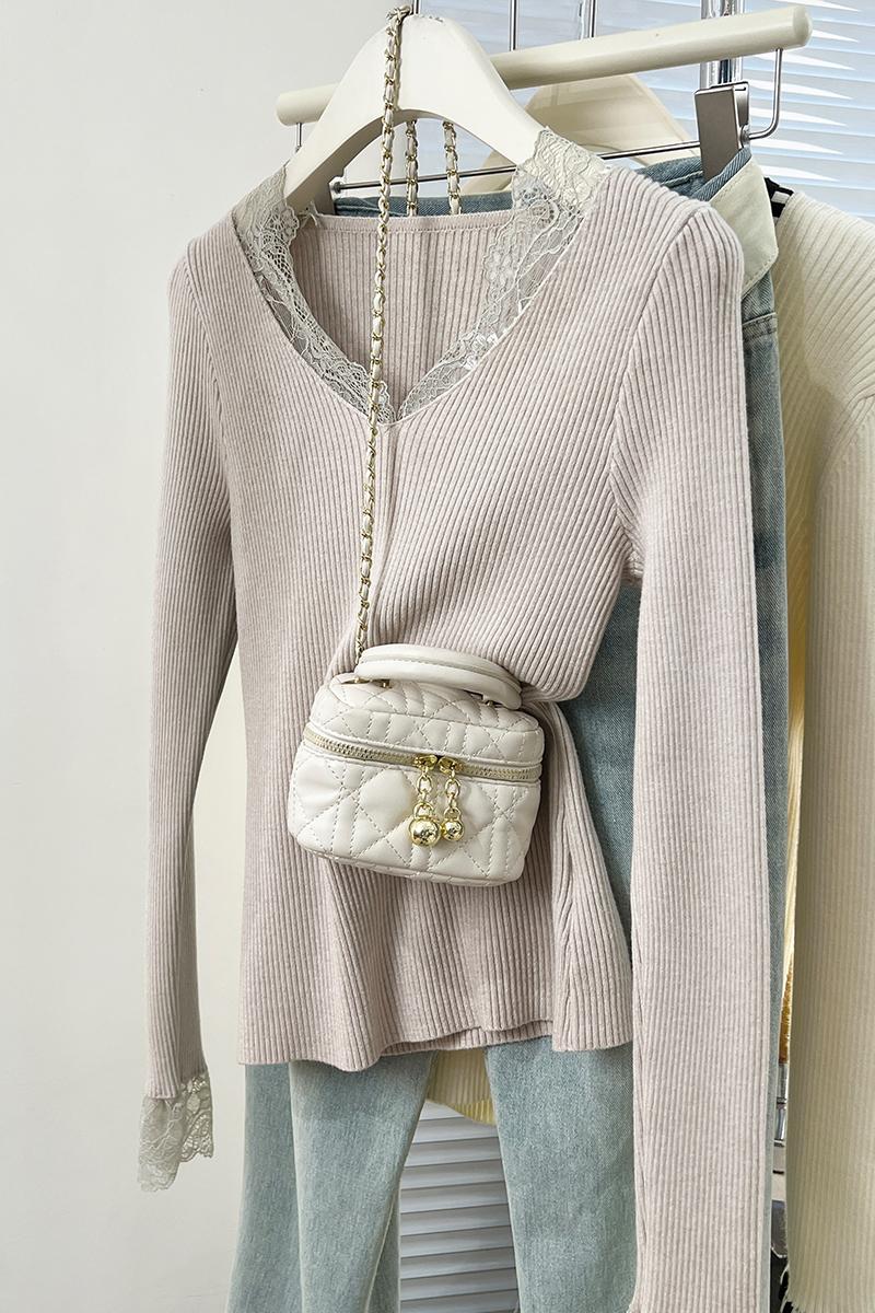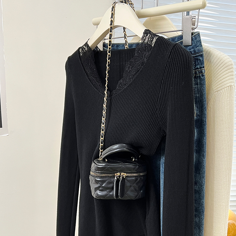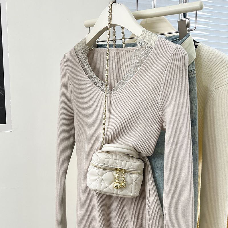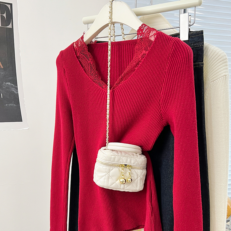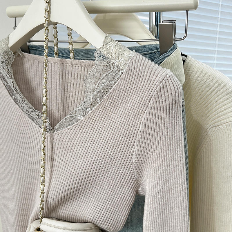 실제 가격 실제 촬영 #EUROPEAN APRICOT V-NECK베이스 셔츠 가을과 겨울 레이스 스웨터 긴팔 스웨터를 가진 여성을위한 여성