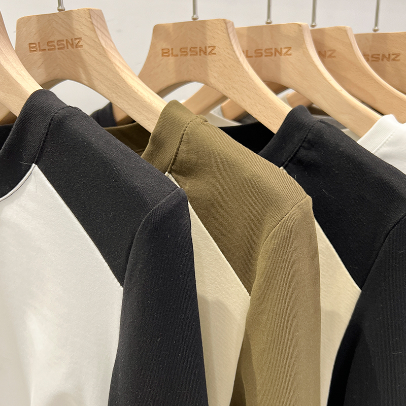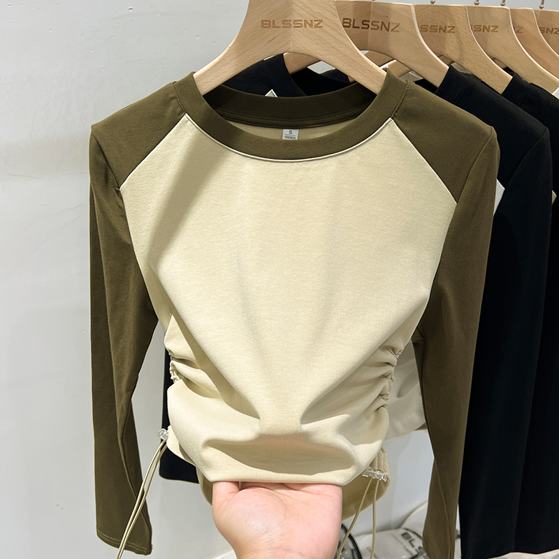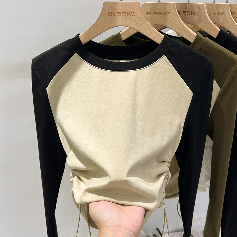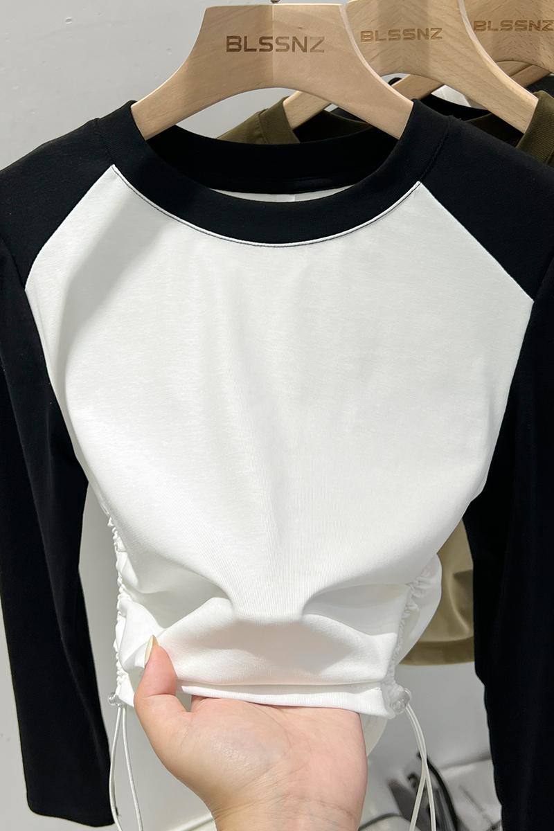 Real-Price Real Shot #DrawString American Retro Short Raglan Sleeves 여성용 긴팔 가을 디자인베이스 셔츠 탑