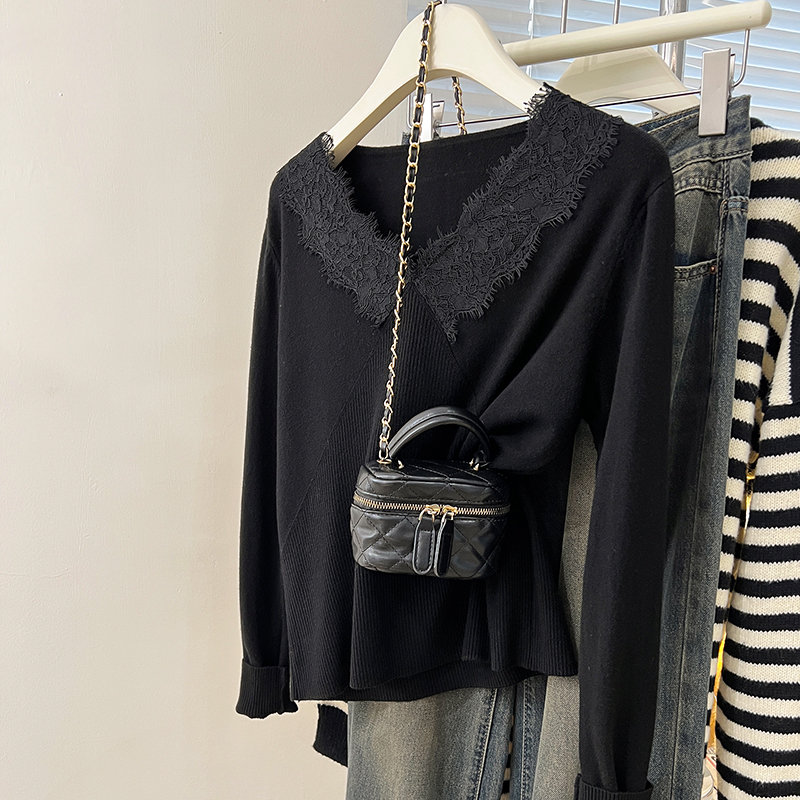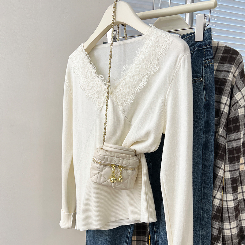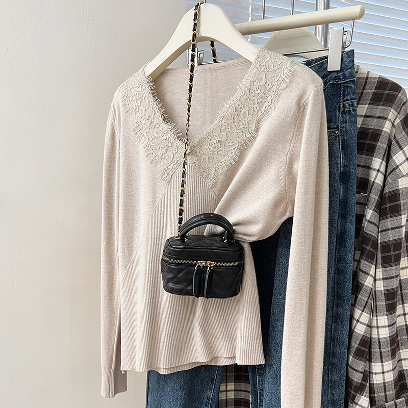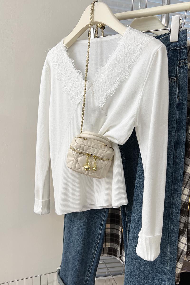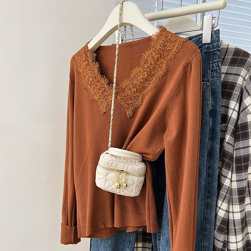 실제 가격 실제 샷 #lace v-neck 니트베이스 셔츠 가을과 겨울 디자인과 두꺼운 스웨터 독특한 트렌드를 가진 여성을위한 니트베이스 셔츠