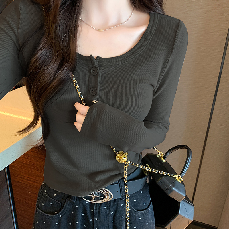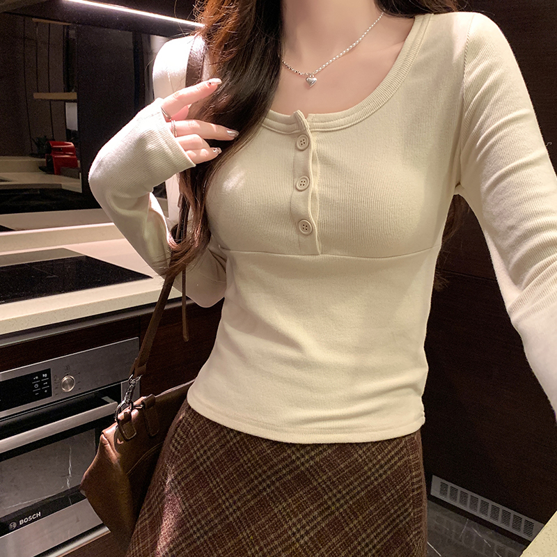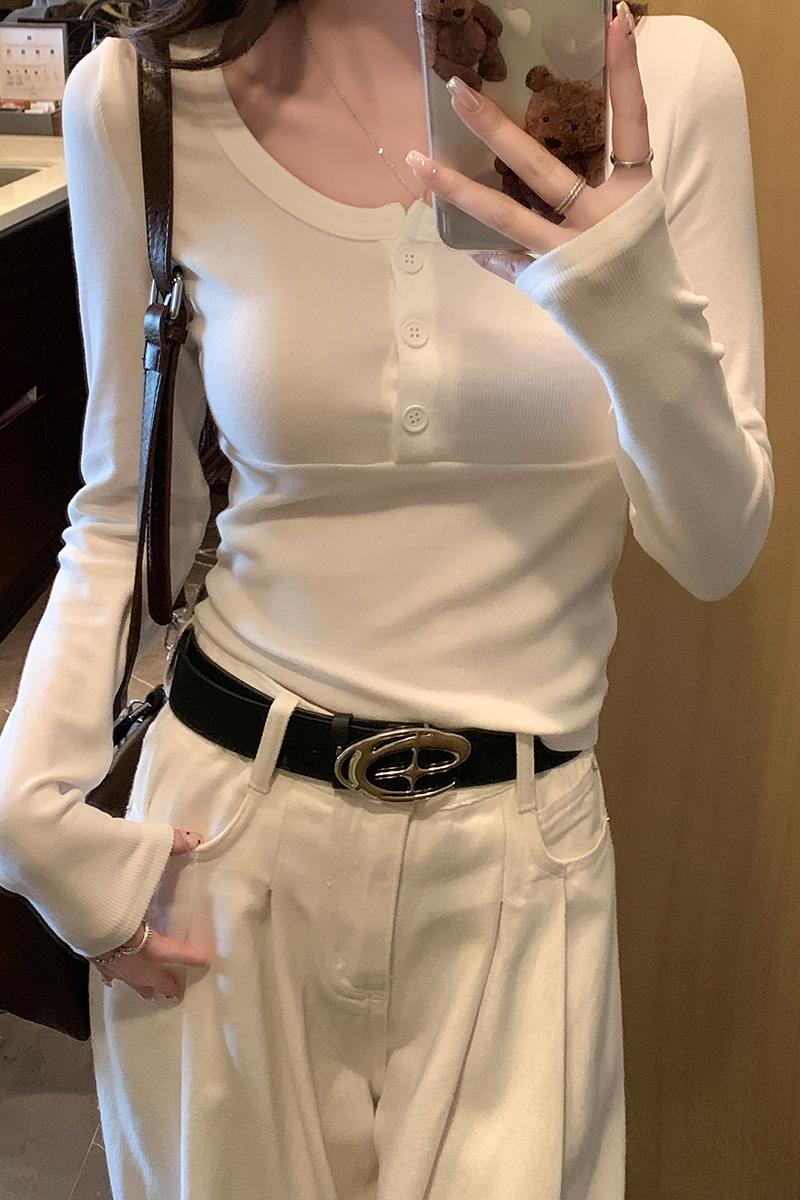 실제 가격 실제 샷 # 가을과 겨울 디자인 틈새 틈새 날씬한 허리 상단 긴 슬리브 티셔츠 ins 트렌디 한 여성을위한베이스 셔츠