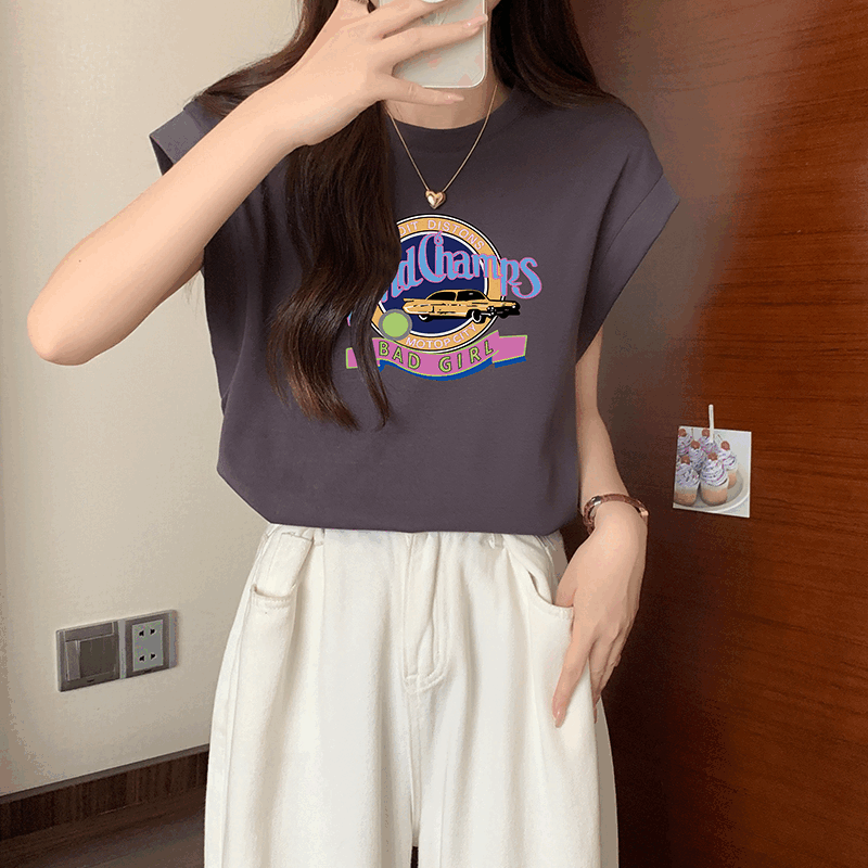 어깨 티셔츠 여성용 세련된 라운드 목 문자 인쇄 느슨한 슬림 탑 디자인