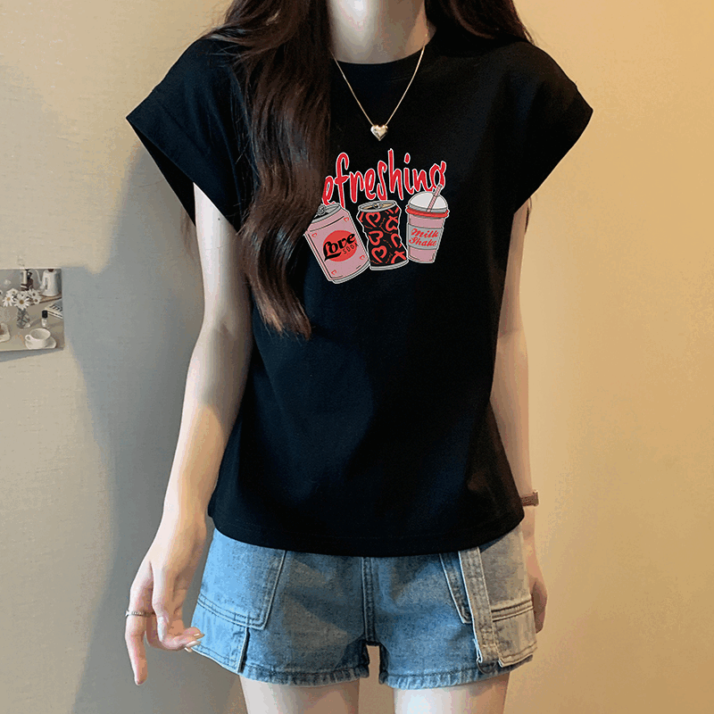 레터 프론트 어깨 소매 티셔츠 여성 단축 여름 디자인 틈새 느슨한 작은 플라잉 슬리브 탑