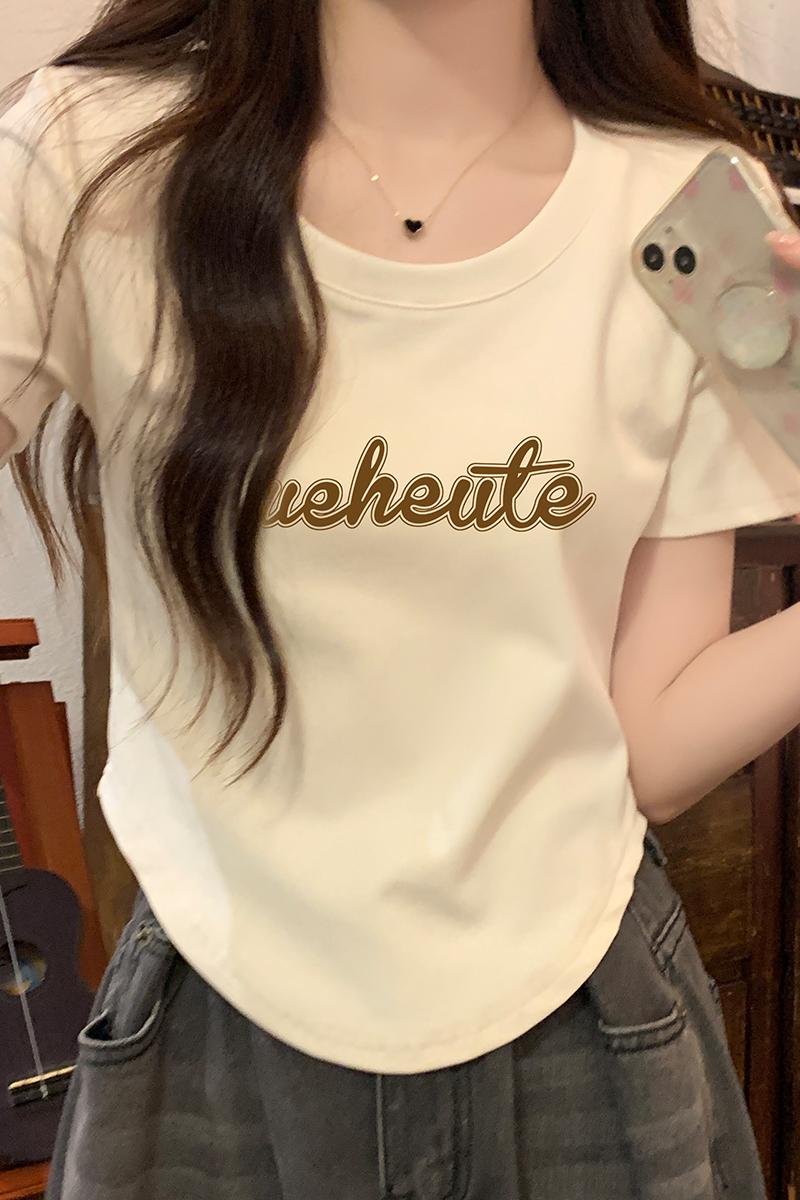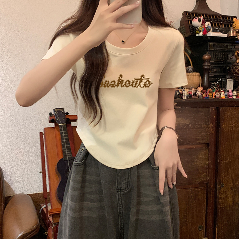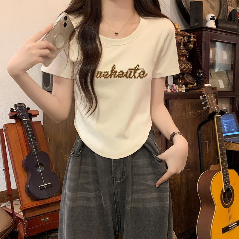 어깨 단락 티셔츠 고급 곡선 밑단 짧은 슬림 하이 허리와 배꼽 핫 걸 탑을 가진 여성