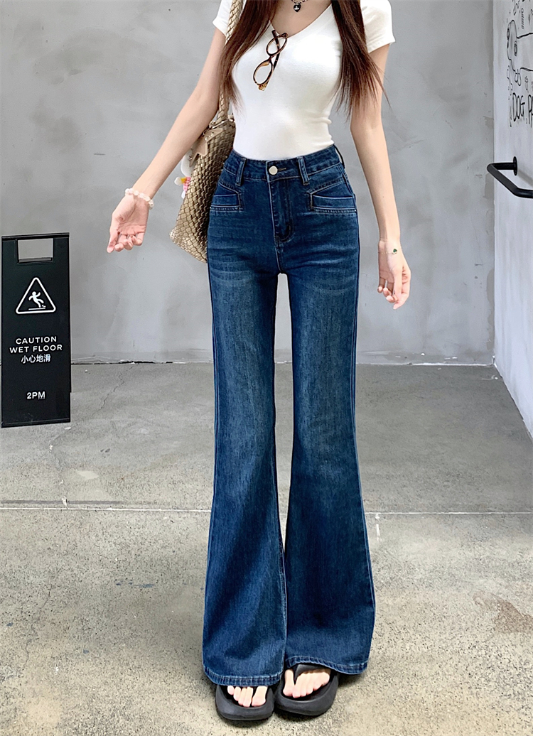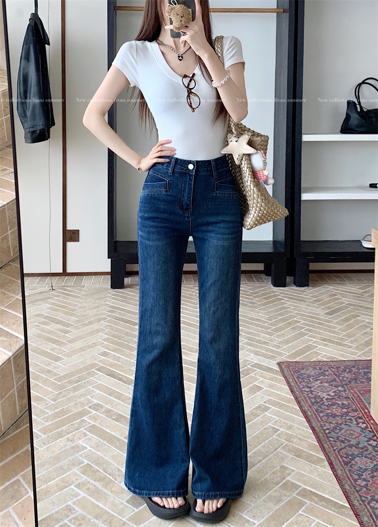 실제 샷과 실제 가격 ~ 여자의 새로운 하이 웨이스트 A- 라인 슬림하고 슬림하고 약간 플레어 바지를위한 진한 블루 레트로 말굽 청바지