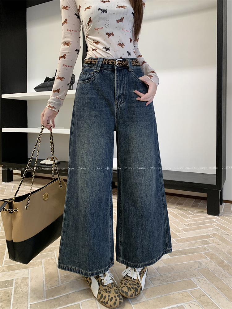 진짜 샷 실제 가격 ~ 가을에 여성을위한 레트로 블루 세척 청바지가 가을 느슨한 스트레이트 바지 넓은 다리 바지 9 포인트 바지