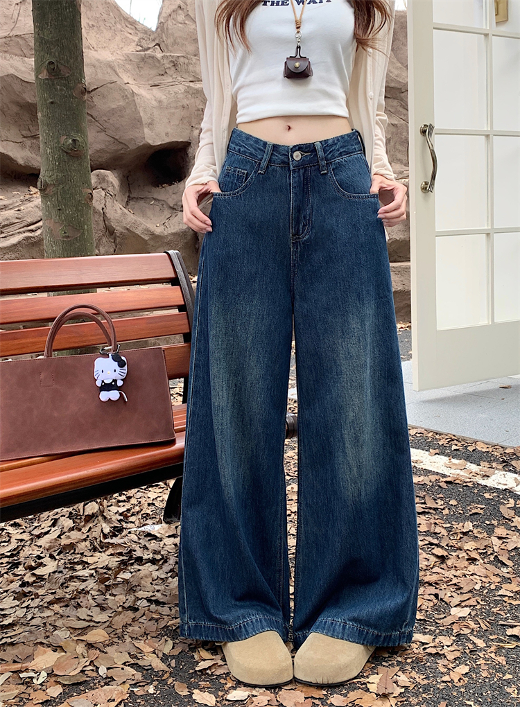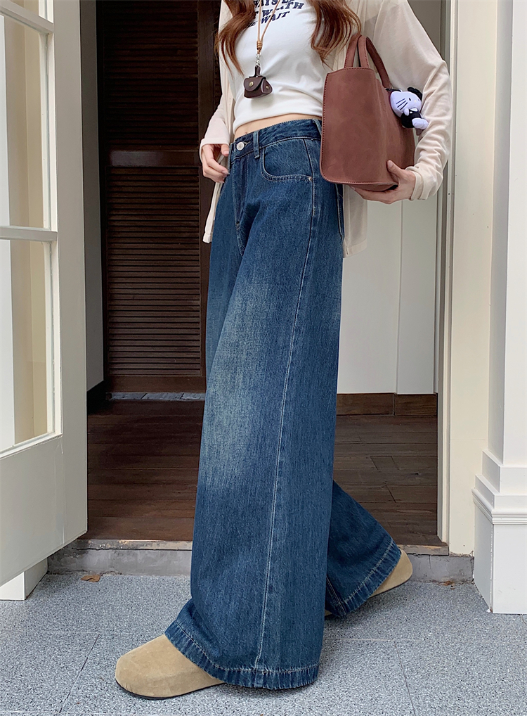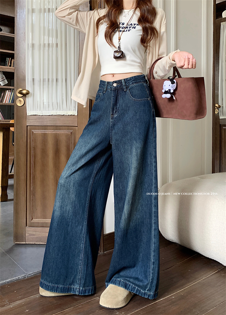 실제 사진과 실제 가격 ~ 여성의 새로운 고위용 A- 라인 슬리밍, 드레이프 직선 바닥 바지를위한 미국 레트로 와이드 레그 청바지