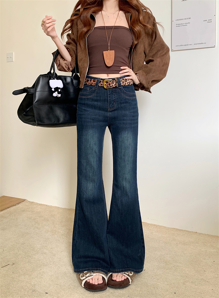 진짜 샷 실제 가격 ~ 2025 년 가을 하이 허리 슬림 한 슬림하고 약간 플래핑 바닥 바지에 여성을위한 진한 블루 레트로 청바지