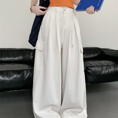 여성을위한 미국 백인 작업복 데님 캐주얼 바지 새로운 하이 웨이스트 느슨한 넓은 레그 스트레이트 레그 걸핑 바지