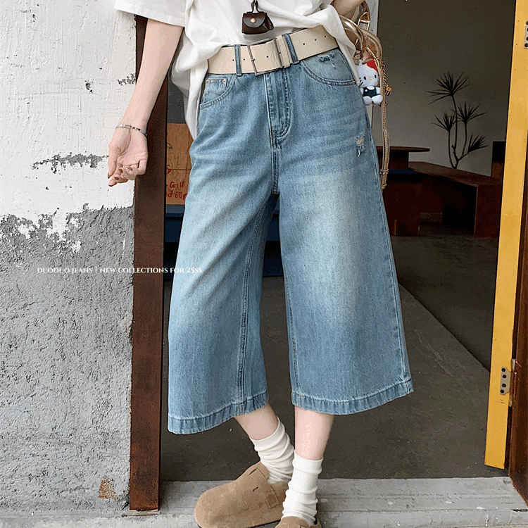 여성을위한 실제 미국 레트로 하이 스트리트 데님 바지 새로운 하이 웨이스트 스트레이트 찢어진 넓은 레그 7 레그 미드 길이 바지