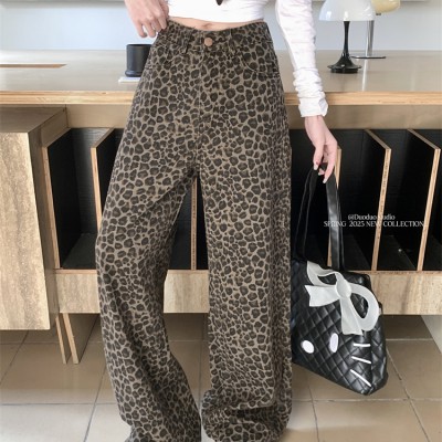 디자인 센스 표범 청바지 여자 새로운 높은 허리 슬림 넓은 다리 스트레이트 도핑 바지