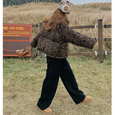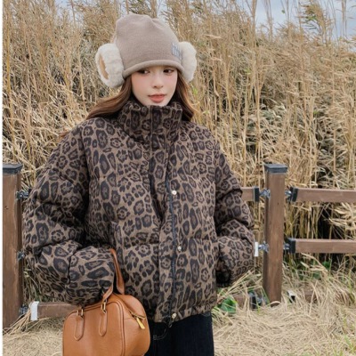 레트로 레오파드 무늬 쇼트 스타일 다운 여성 겨울 25 새로운 고급 센스 작은 대중 켄 콩 스탠드 칼라 패딩 재킷 면 의류 재킷