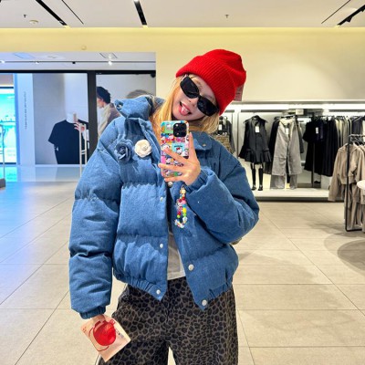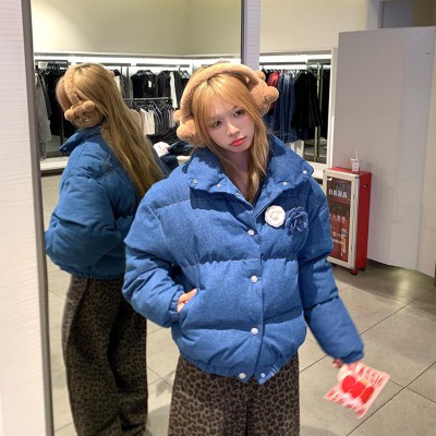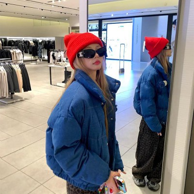 jennie 같은 단락 파란색 데님 여성 겨울 새로운 쇼트 스타일 면 의류 루즈핏 패딩 재킷 스탠드 칼라 면 옷 재킷