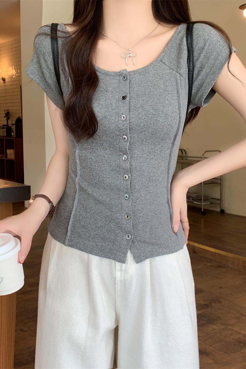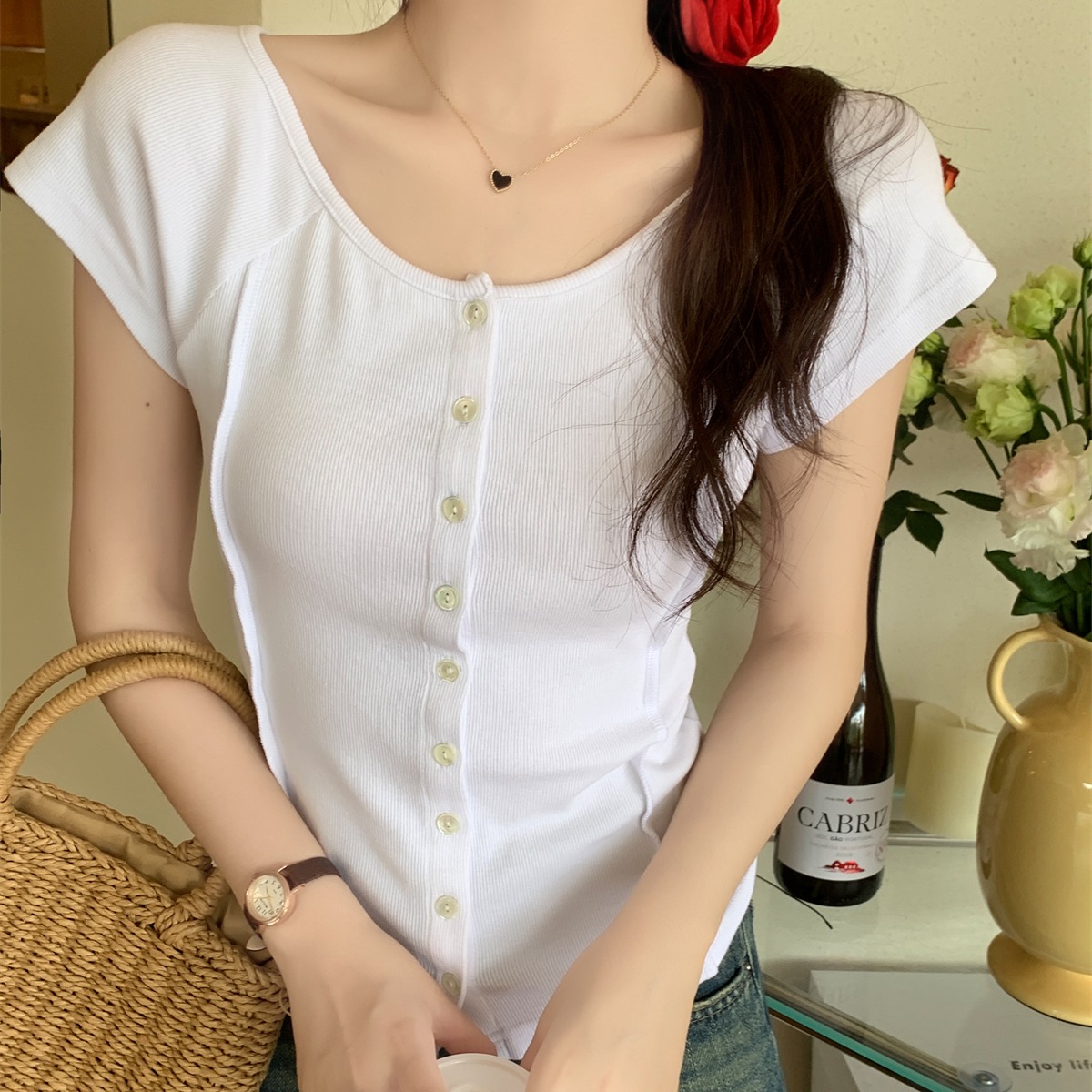 진짜 사진 여름 한국어 버전의 기질 U-Neck 간단한 단색 얇은 6 개의 양모 다목적 스웨터 단락 상단