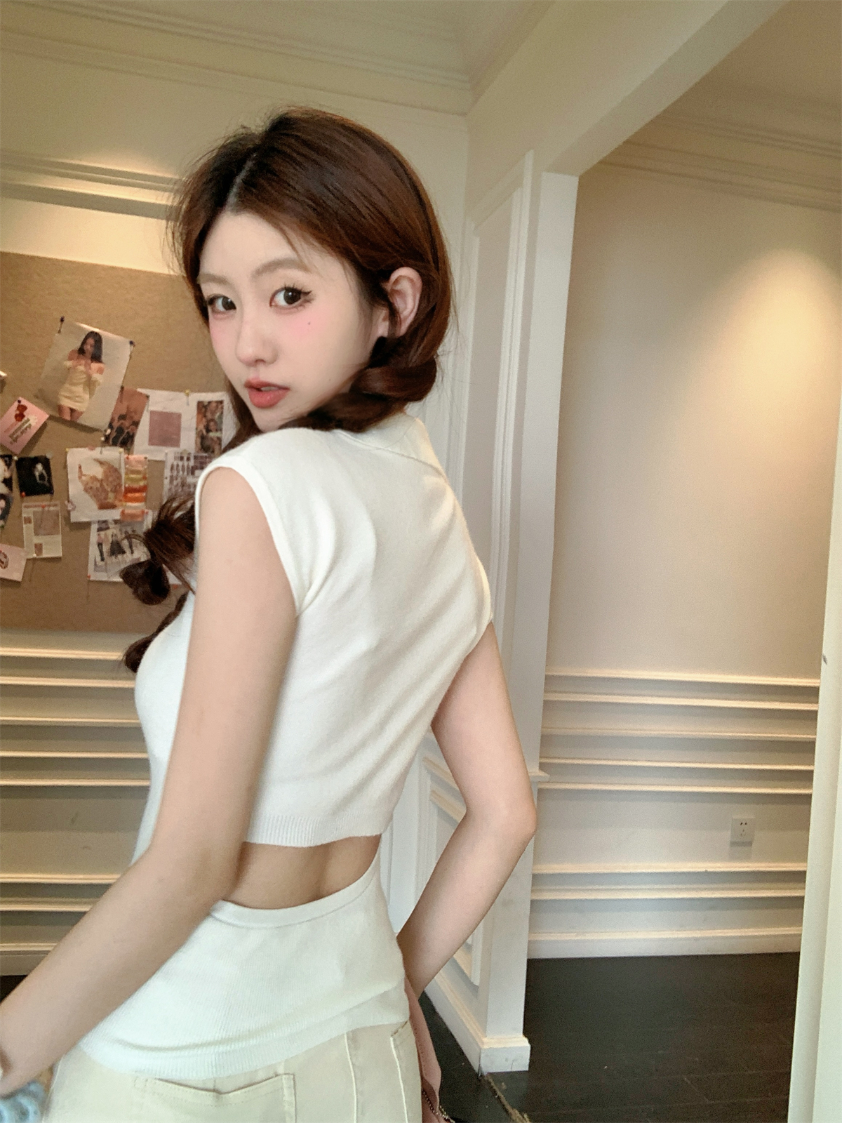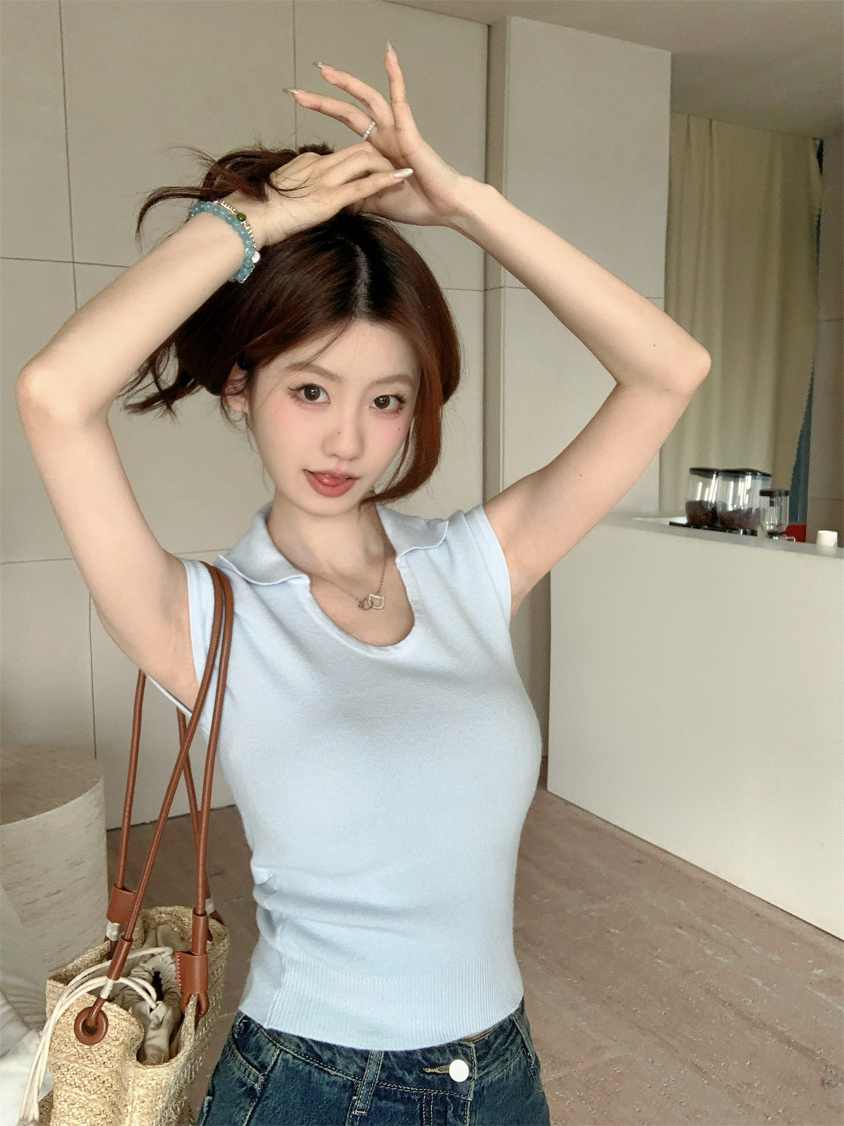 여름 한국 스타일 슬림 폴로 활 자수 주름 슬림면 단락 티셔츠 탑