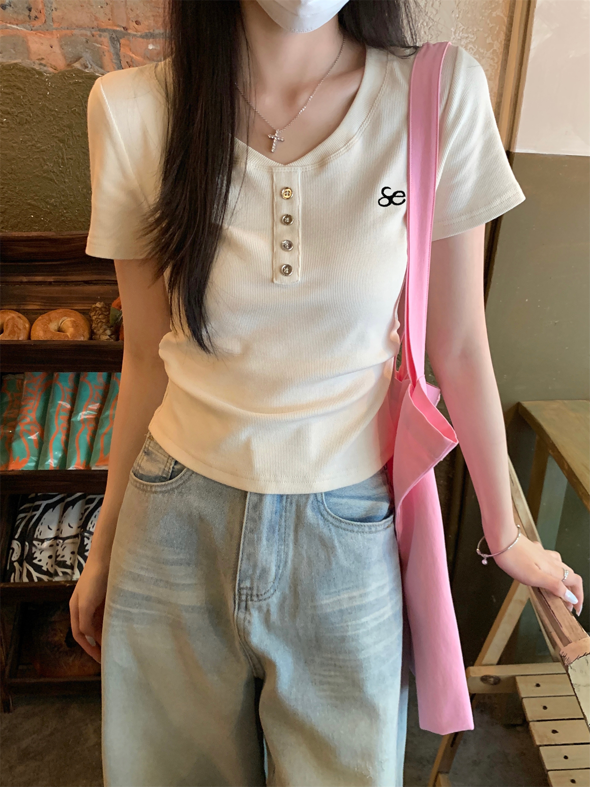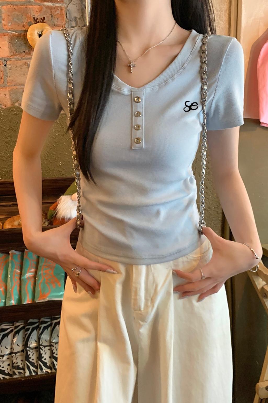 실제 주사 및 여름 순수 슬림 검은 귀 대조 대조 컬러 활 순수면 단락 티셔츠 여성