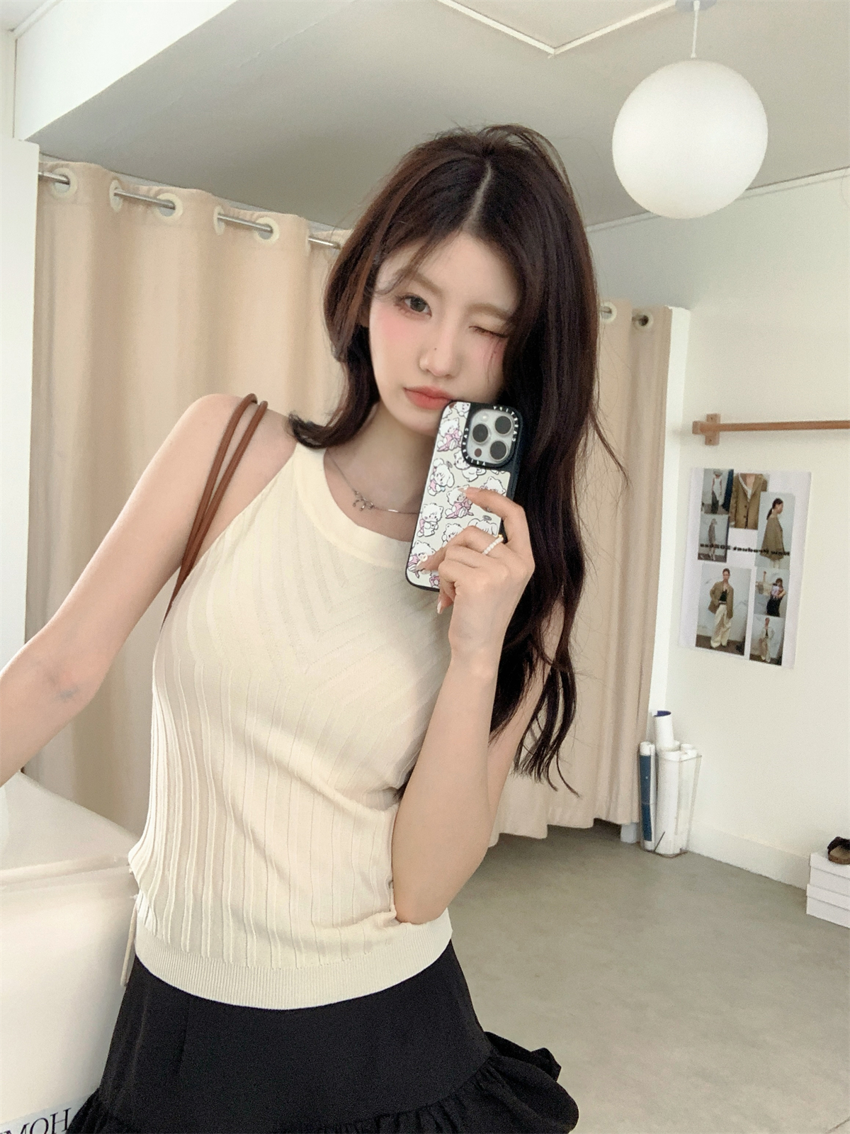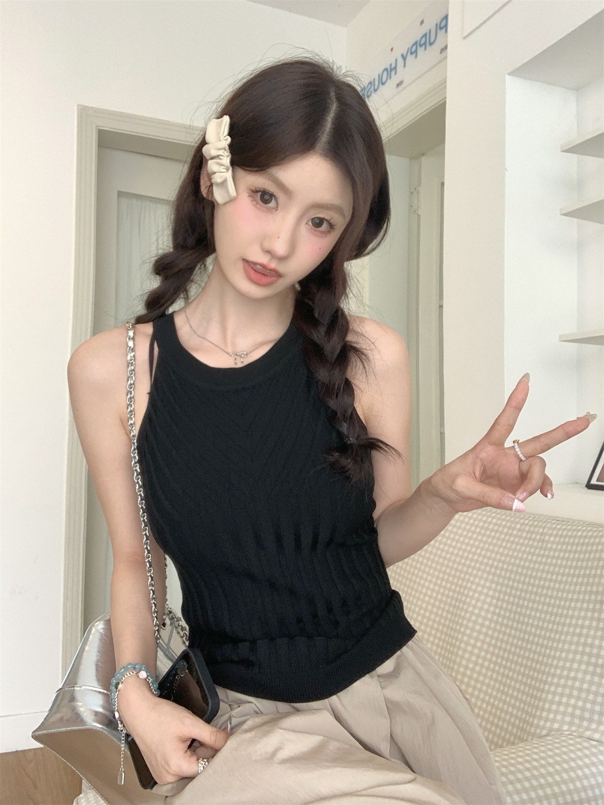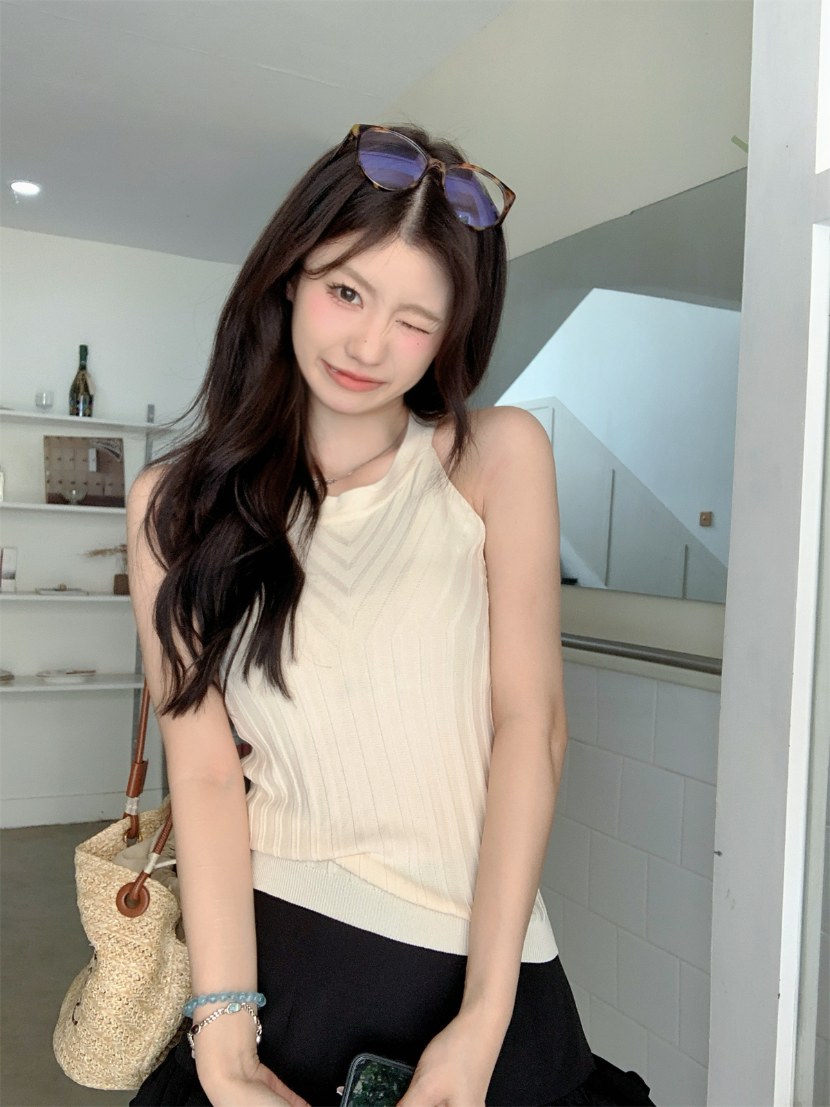 여름 반 오픈 칼라 스트레이트 어깨 뼈 뼈 디자인 다목적 순수면 단락 티셔츠 탑