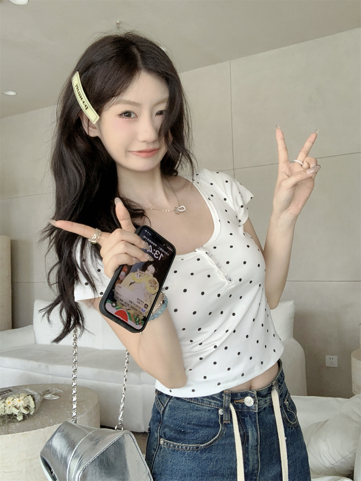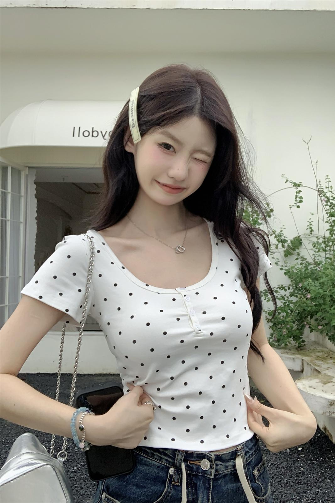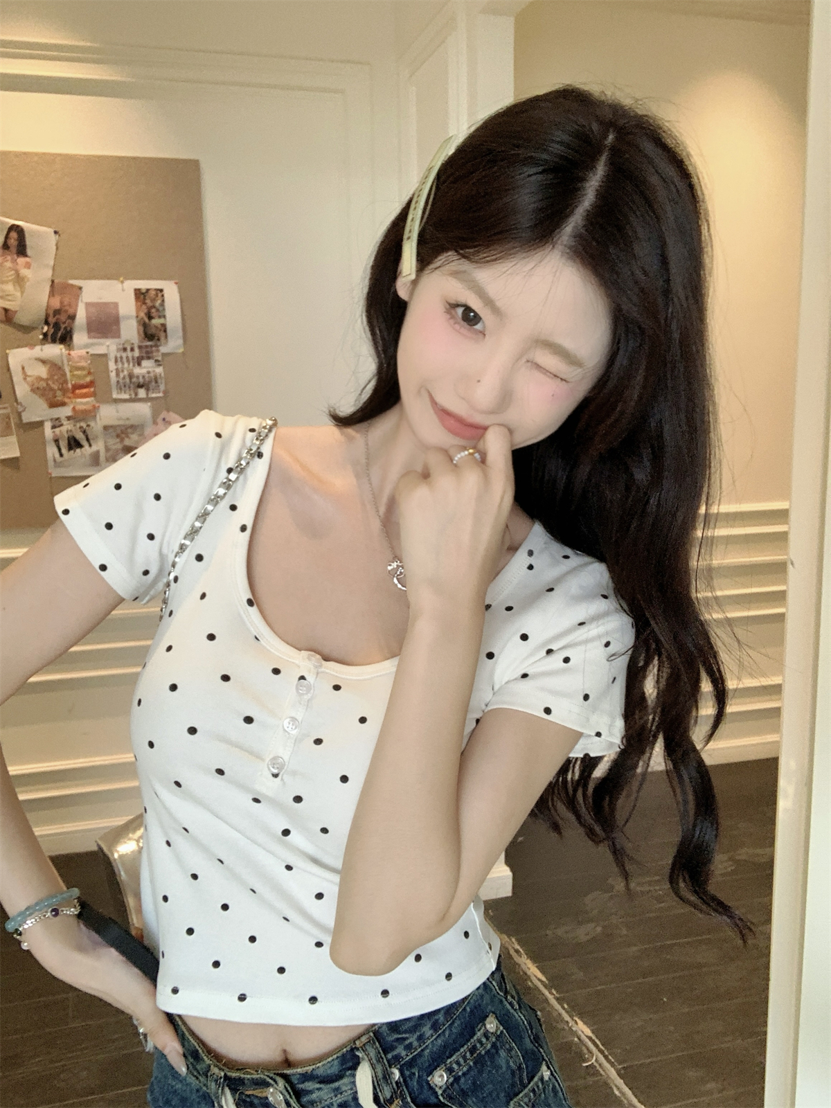 여름 한국어 버전 슬림하고 달콤한 중공 레이스 업 어깨 디자인 니트 짧은 슬리브 탑