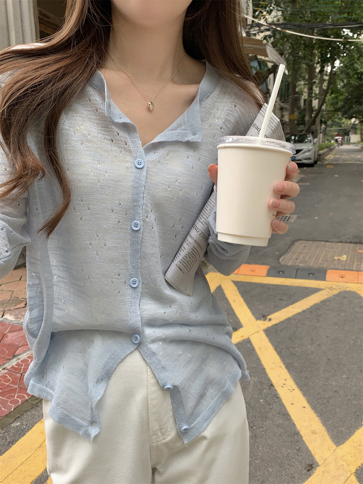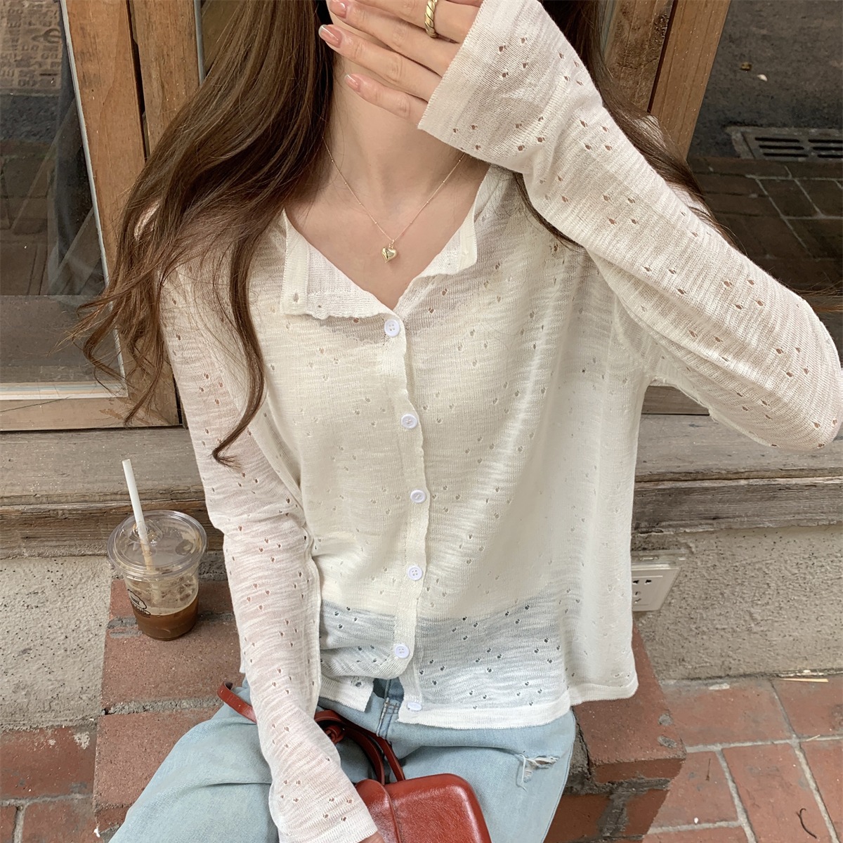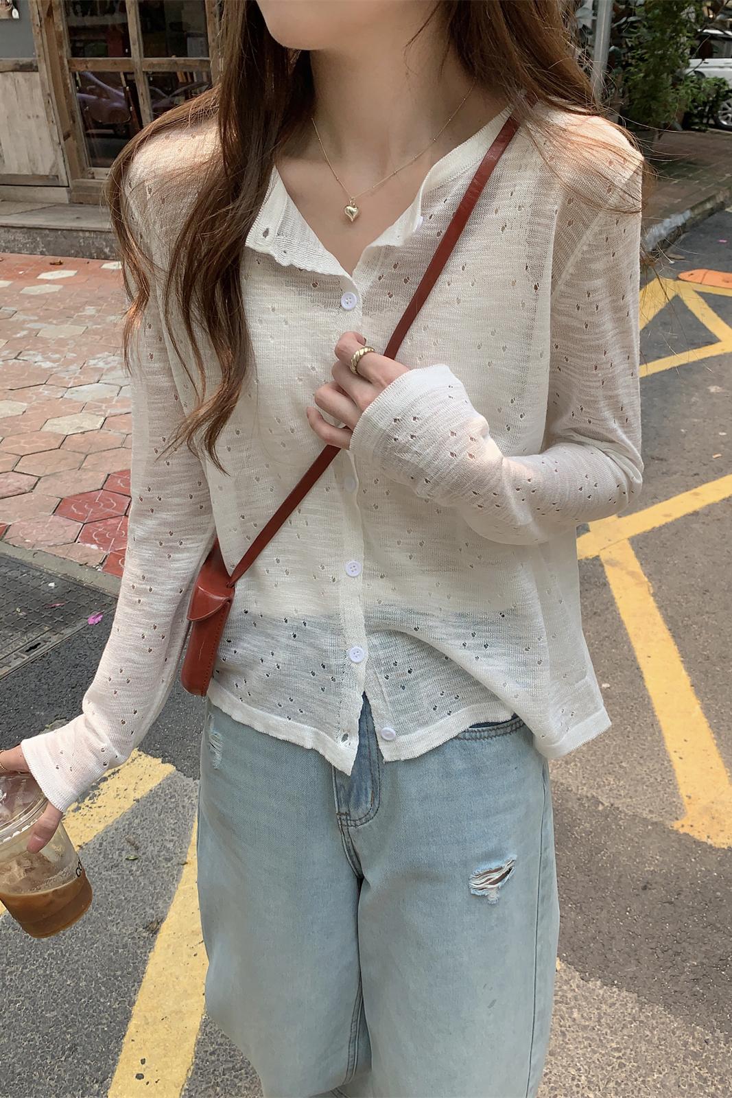 실제 사진 여름 한국 스타일 스타일 블랙 이어 레이스 업 카디건 짧은 선 스크린 니트 탑