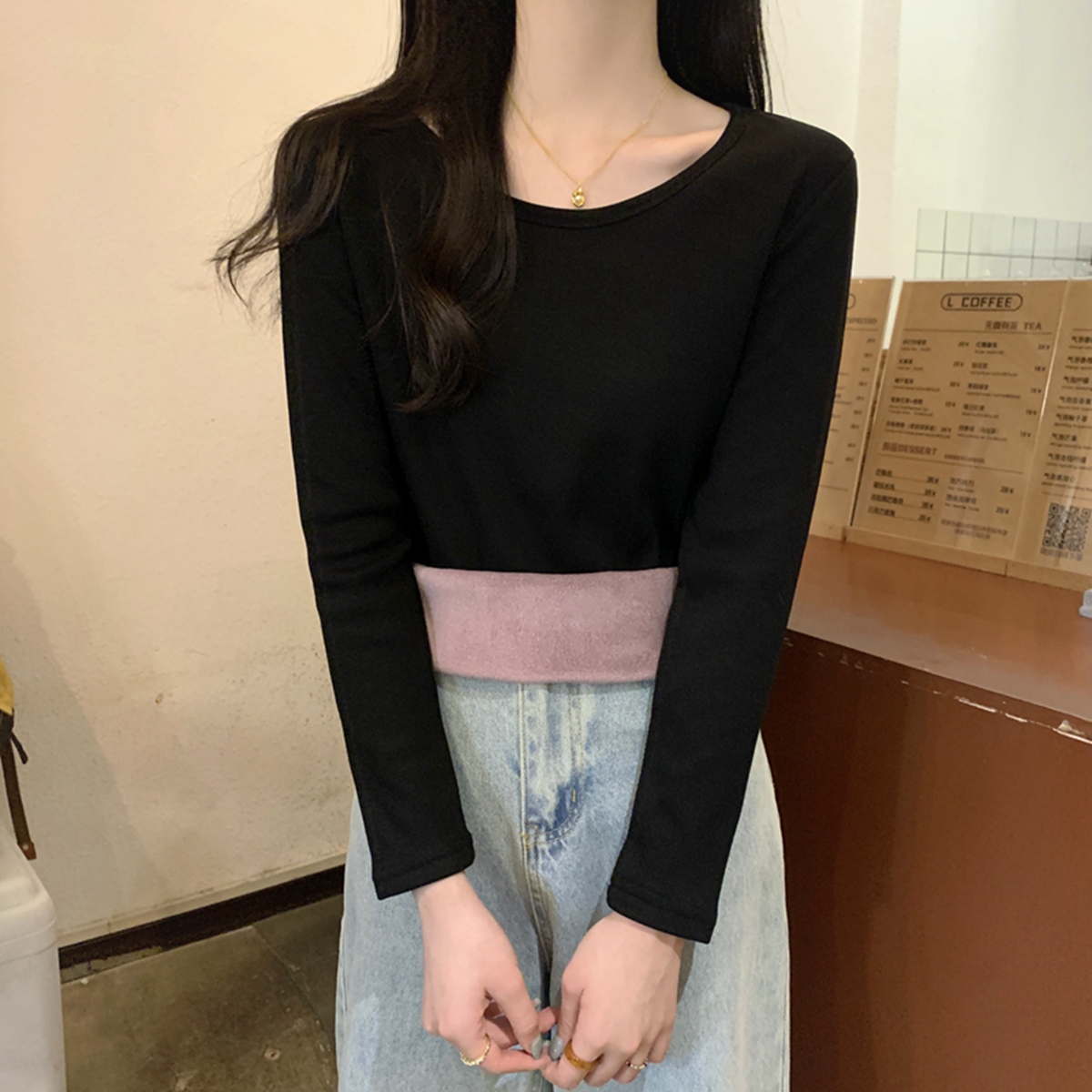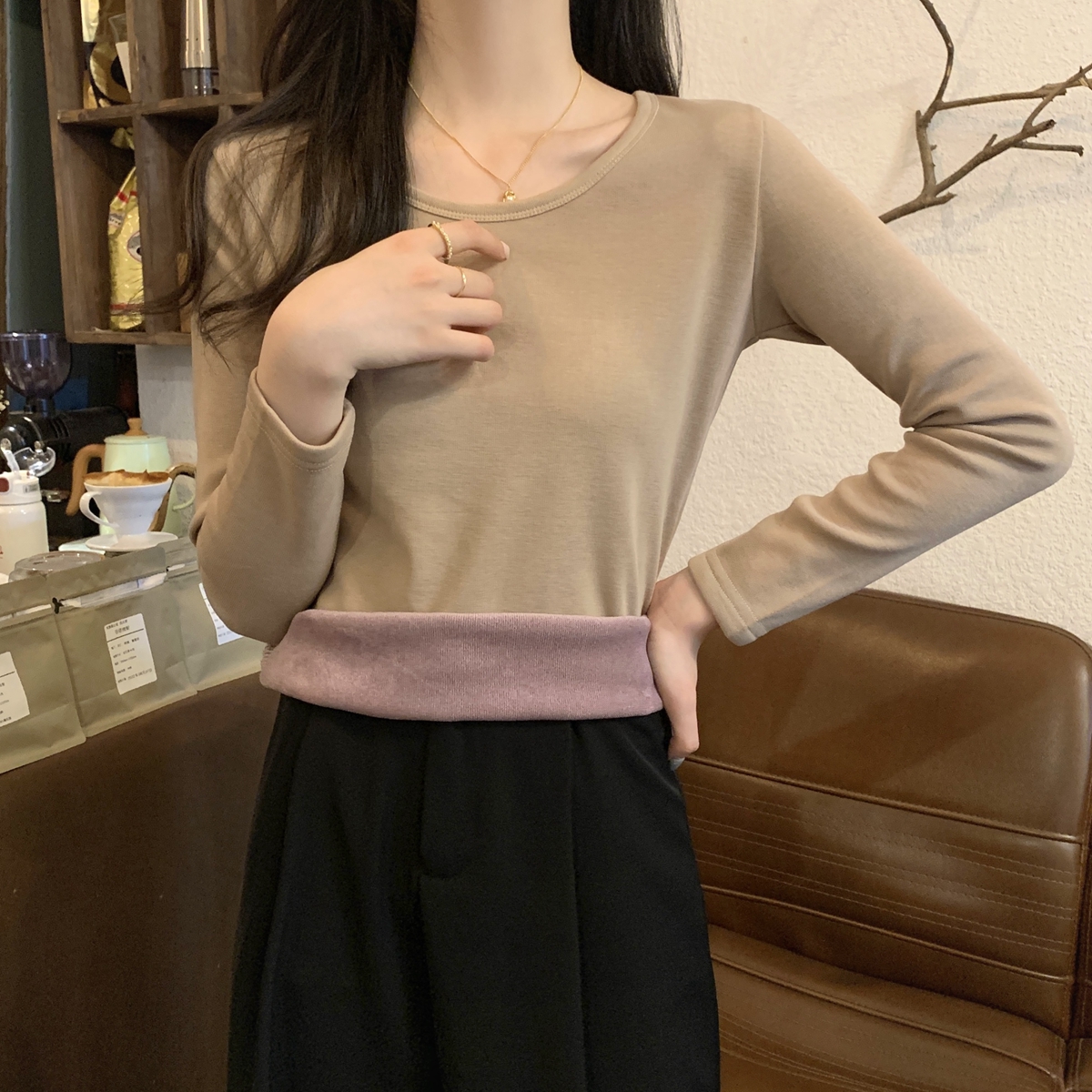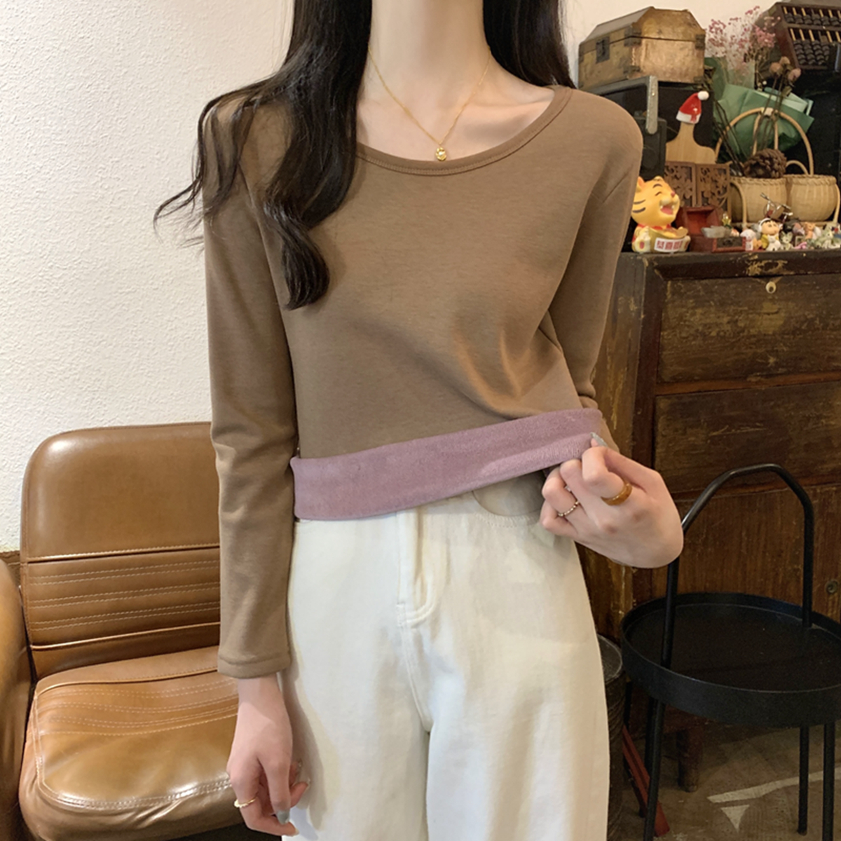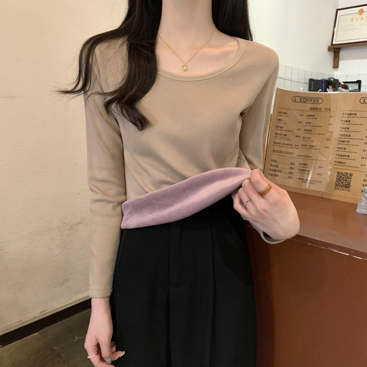 한국 스타일의 슬림 한 내부 폴로 칼라 버튼 디자인. 인사 벨벳 따뜻한 긴팔 티셔츠 탑