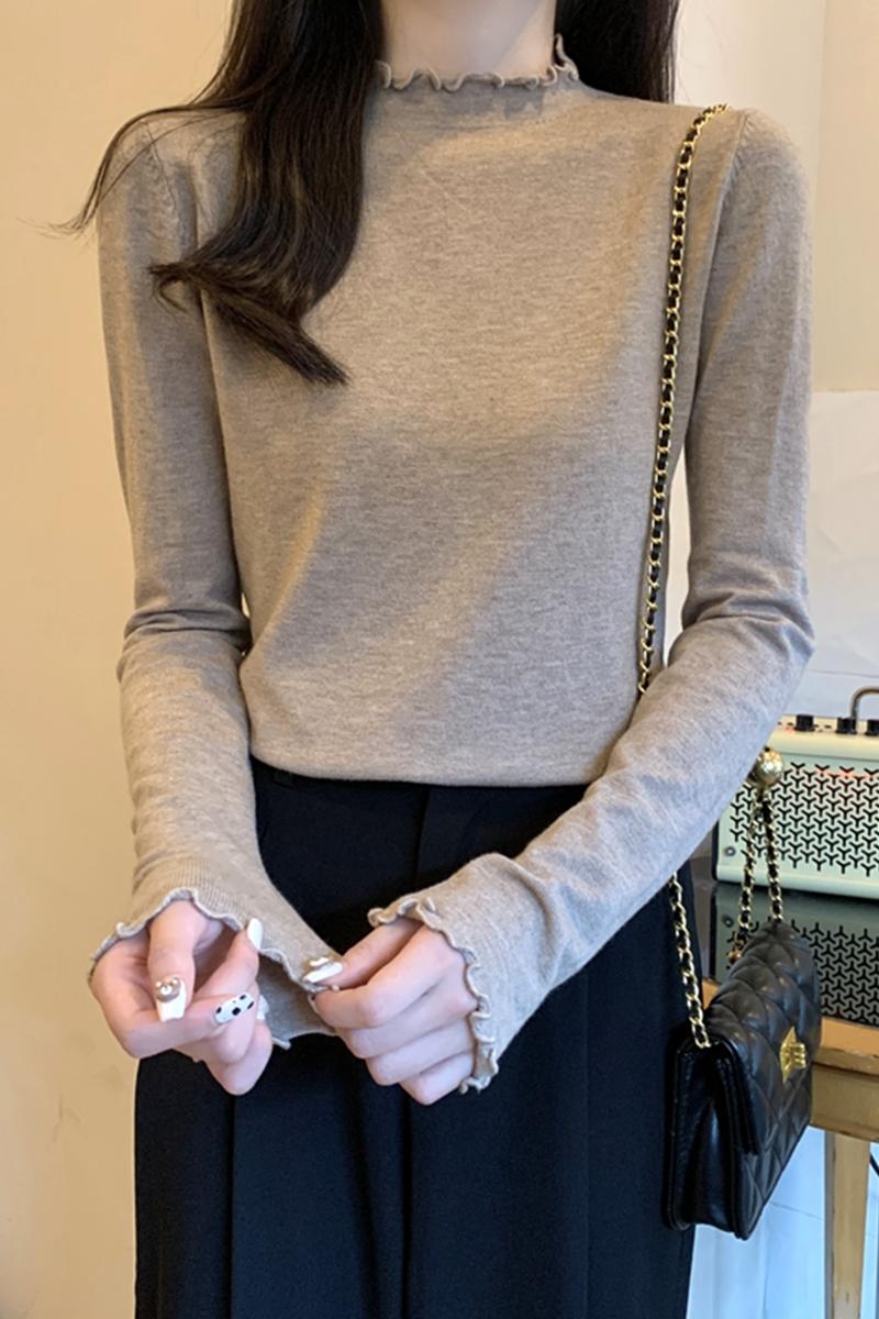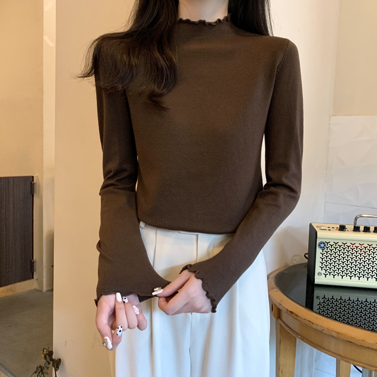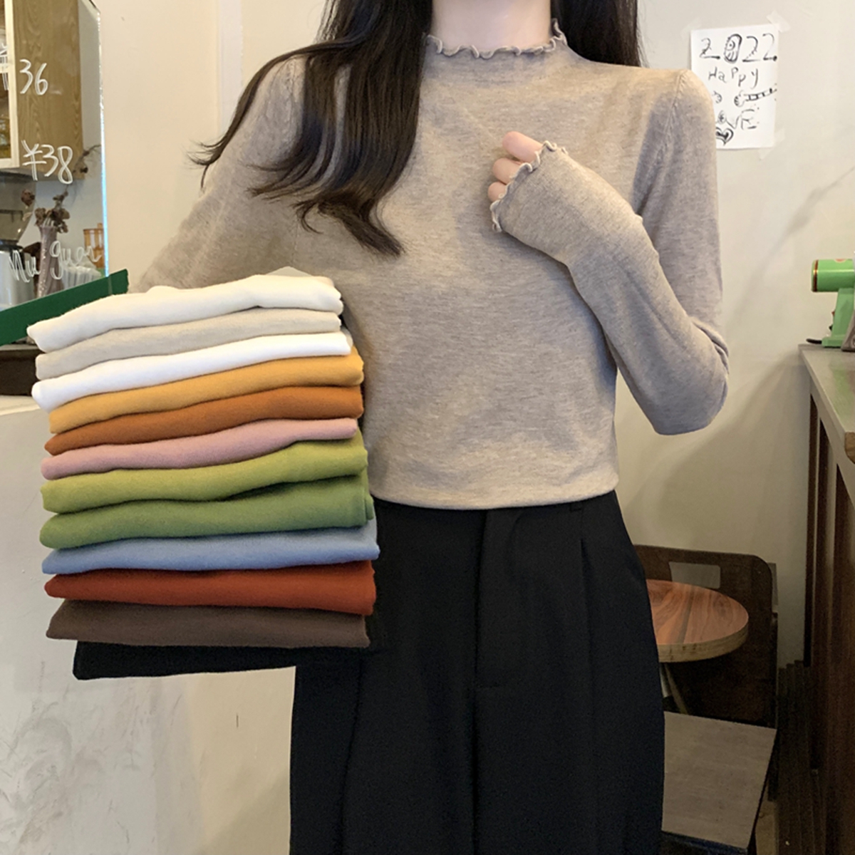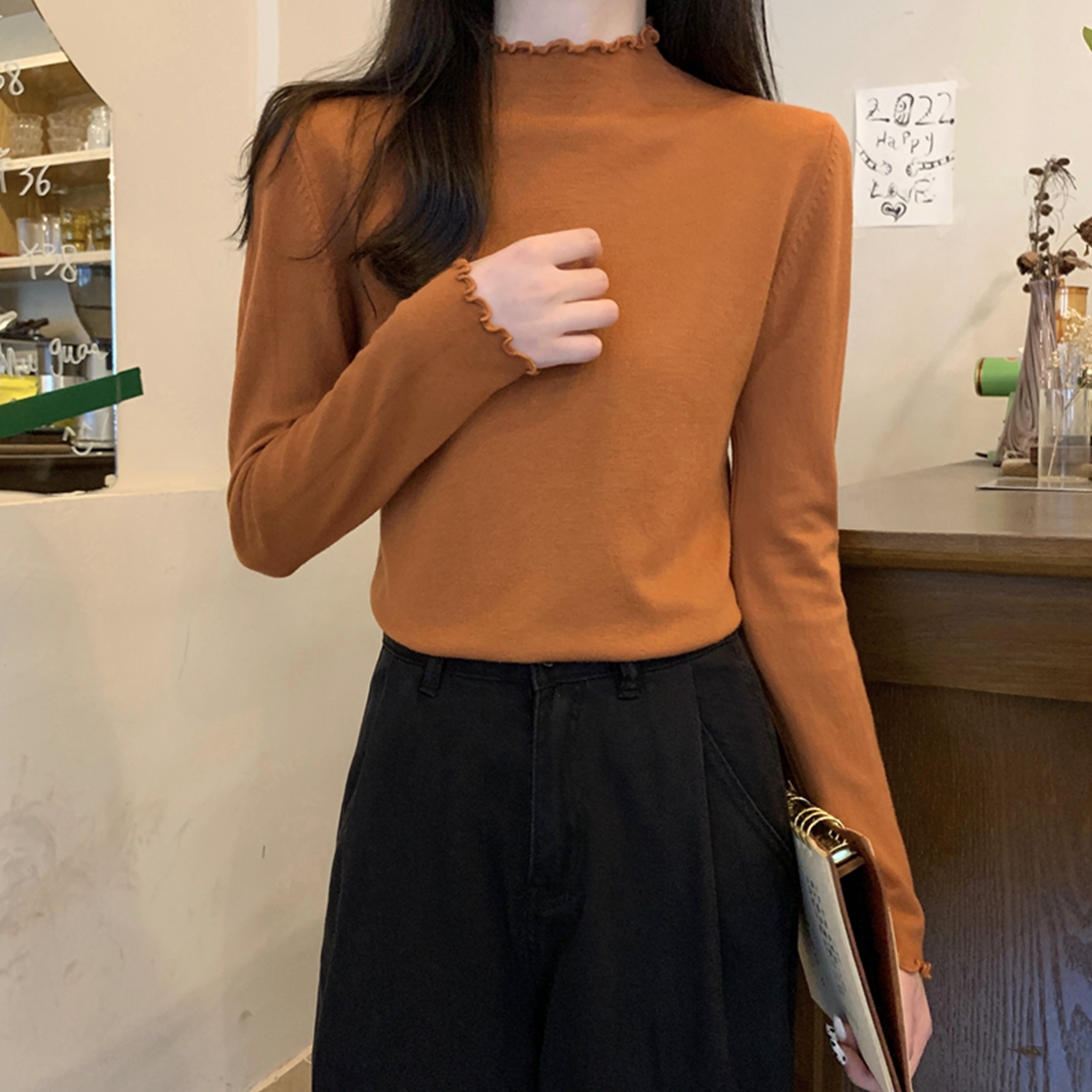 실제 사진 앤디 벨벳 니트베이스 스웨터와 함께 한국 스타일 다목적 기본 반 높이 곱슬 곱슬 가장자리