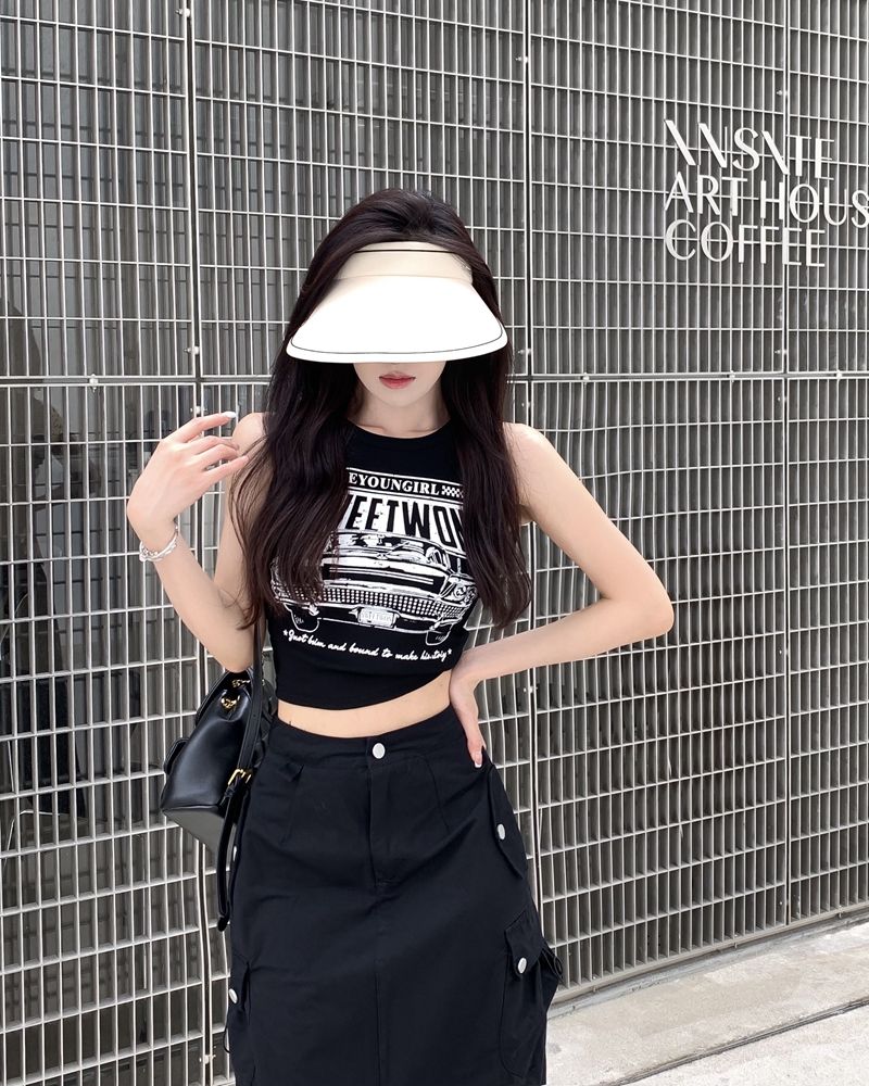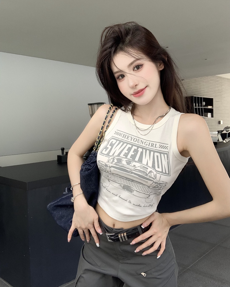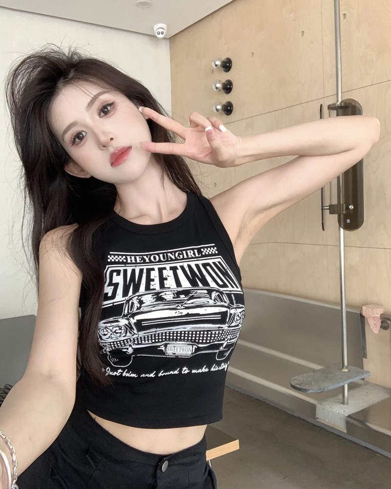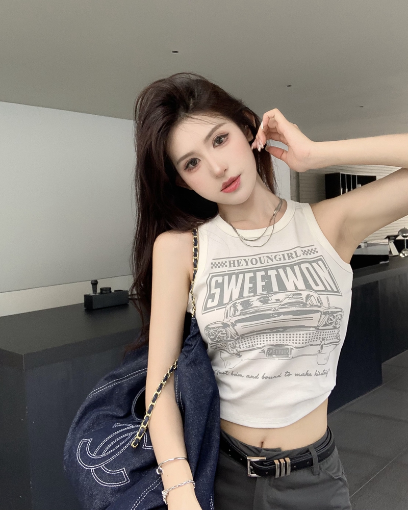 실제 삶의 뜨거운 소녀 스타일 레트로 편지 소형 자동차 프린트 슬림 한 슬림 조끼 슬림 조끼 여성 배꼽 노출 된 짧은 탑 트렌디