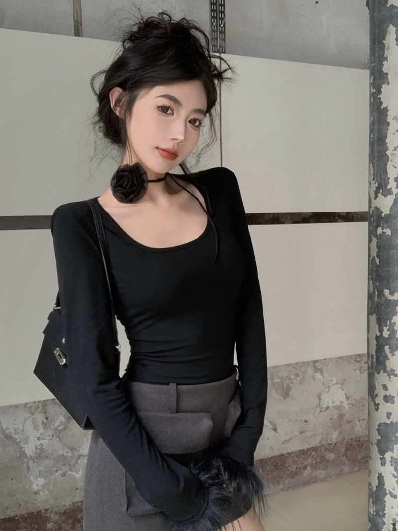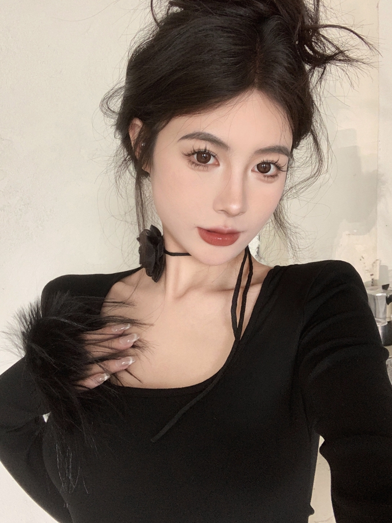 진짜 가격 달콤하고 매운 슬림 핏 짧은 고삐 목 쇄골 봉제 탑 꽃 플러시 내부 상단