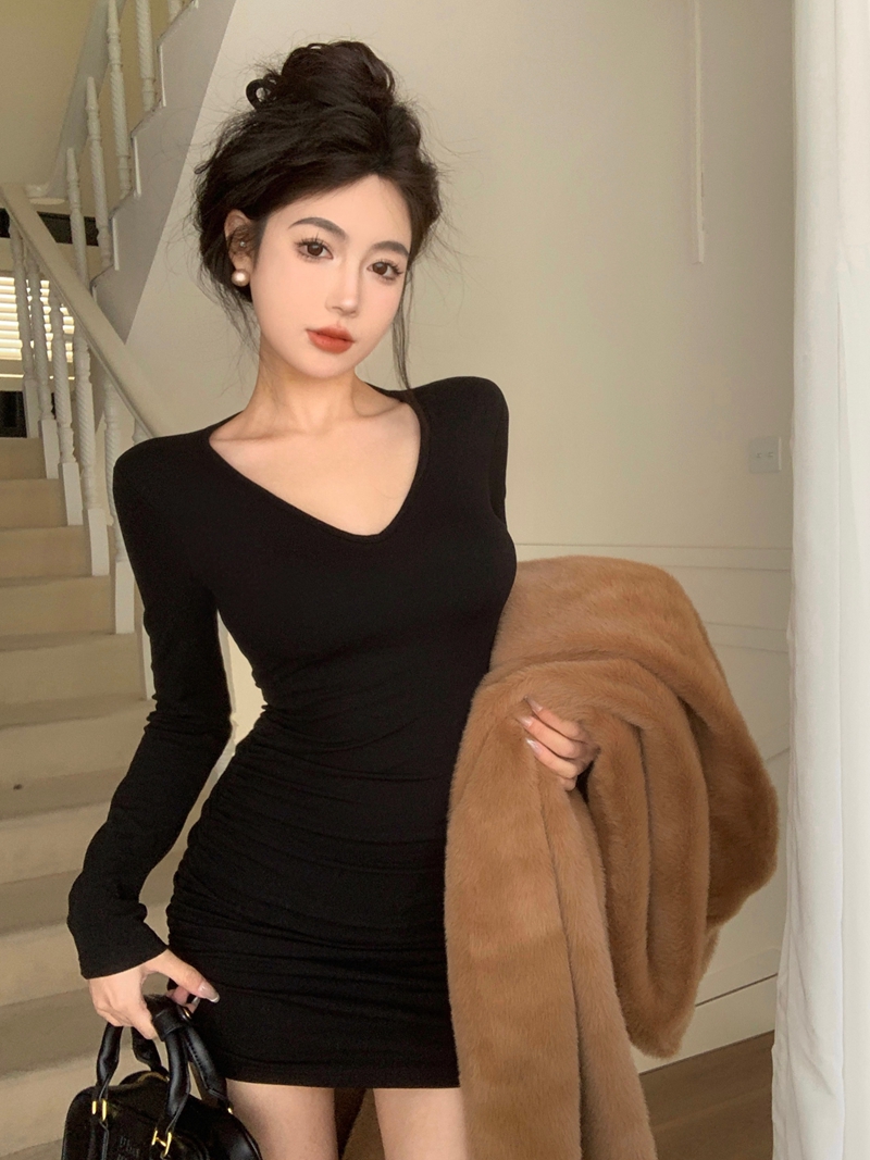 진짜 가격 순수한 섹시한 여자 스타일 슬림과 벨벳 내부 V- 넥 하단 바닥 어깨 패드 드레스