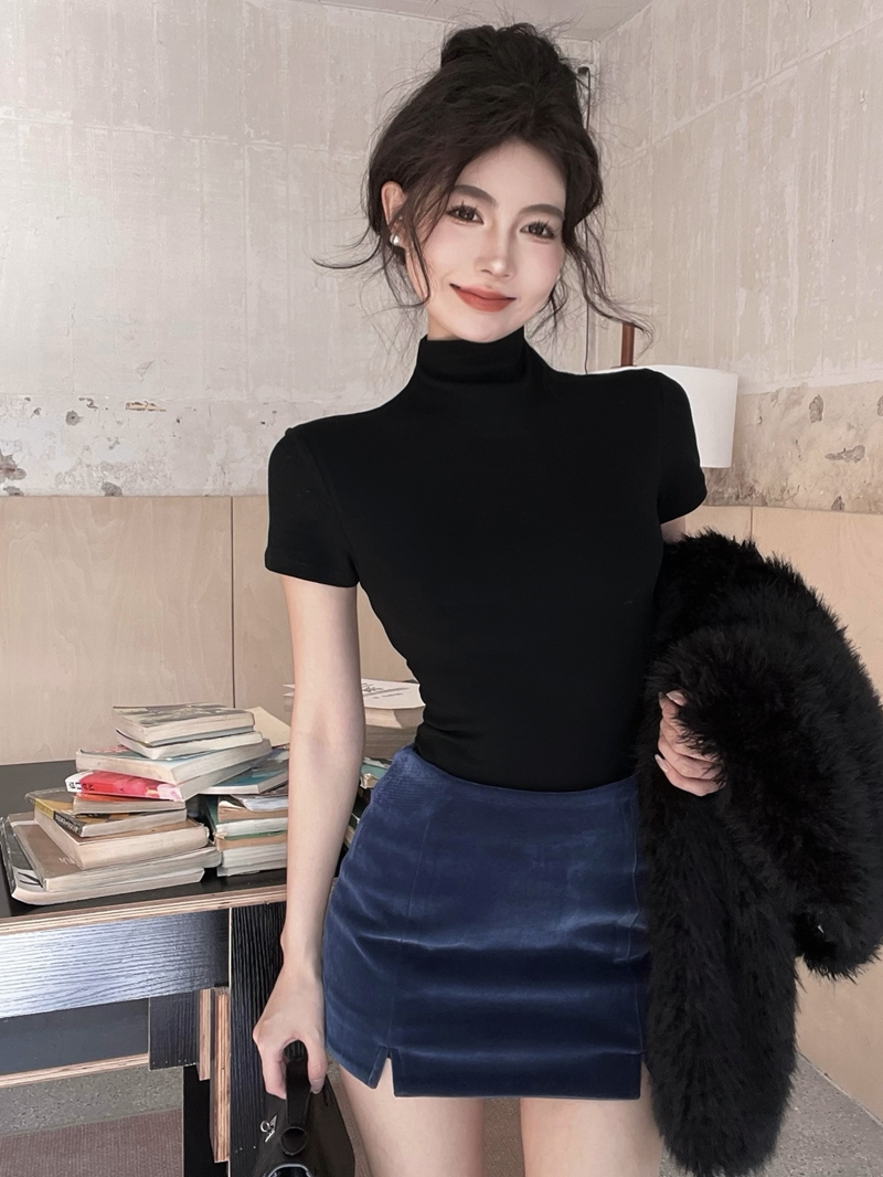 실제 가격 프랑스 레트로 반 높이 넥 하이 탄성 내부 벨벳베이스 셔츠 짧은 슬림 티셔츠 슬림 니트 탑