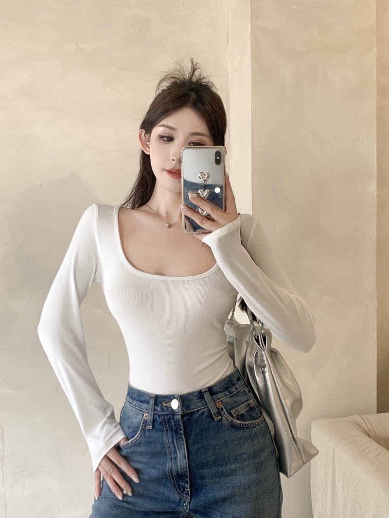 실제 사진은 가슴, 슬림 한 핏, 드러나는 쇄골, 섹시한 꽉 바닥 셔츠, 사각형 칼라, 긴팔 티셔츠를 보여줍니다.