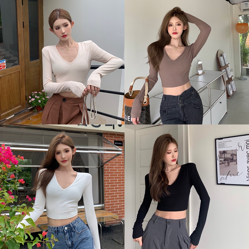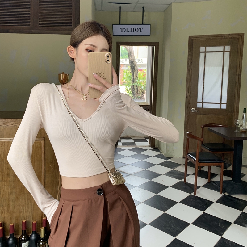 실제 사진 및 실제 가격 소형 섹시 V- 넥 탄성 탄성 슬림 한 짧은 내부 마모 어깨 패드베이스 셔츠 긴 소매 스키딩 티셔츠