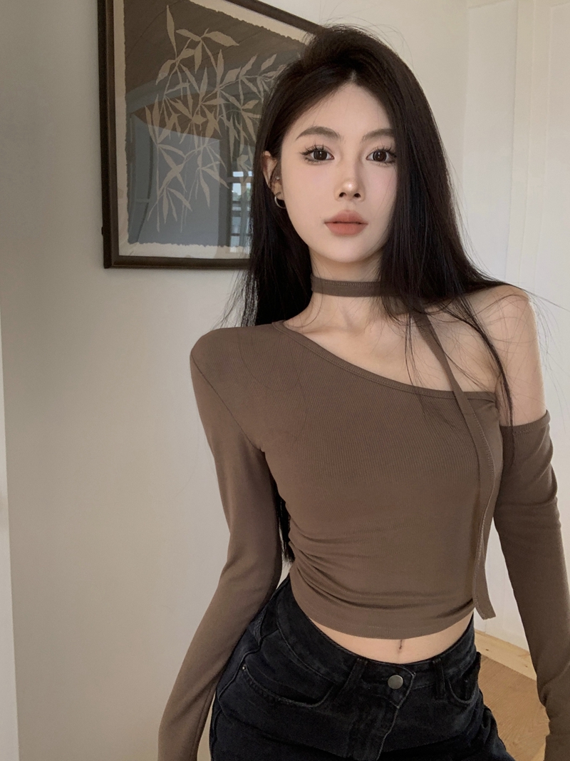 실제 가격 샷과 실제 가격 섹시한 섹시한 핫 걸 스타일 슬림하고 탄성 슬림 기울어 진 칼라 오프 숄더 스트랩 마모베이스 셔츠