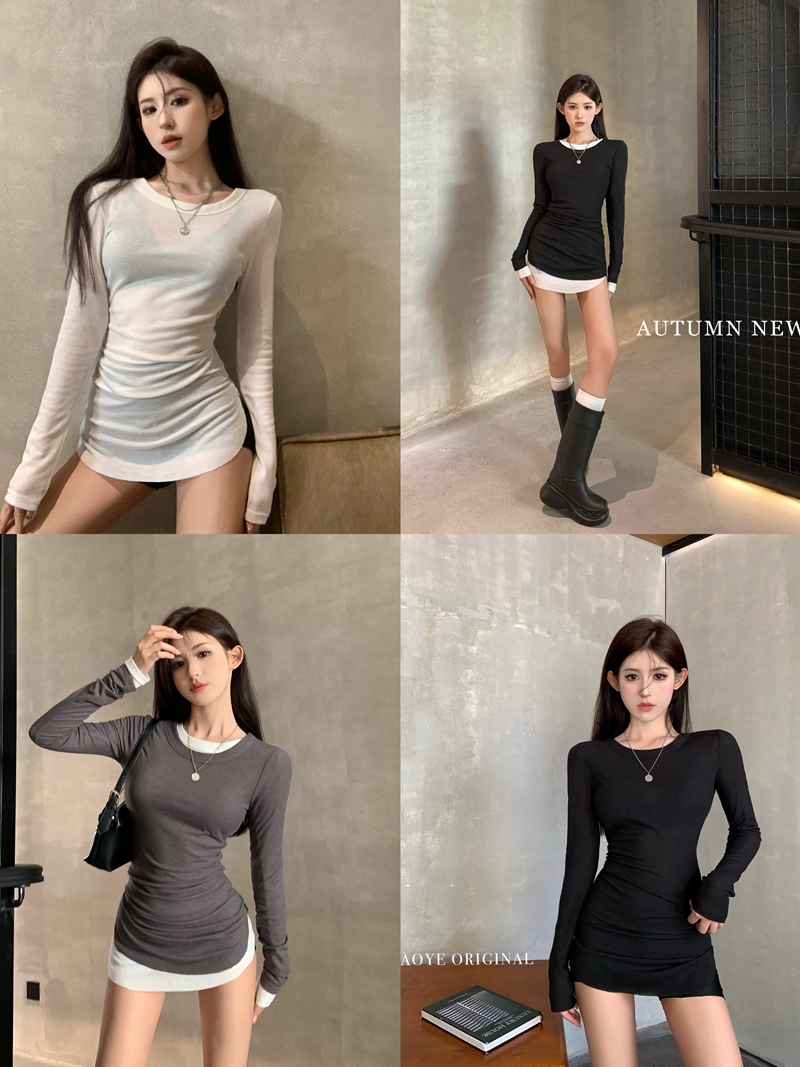 실제 가격 qiu 순수 섹시한 뜨거운 여자 스타일 레이어 긴팔 티셔츠베이스 셔츠 중간 길이 약간 투명한 탑