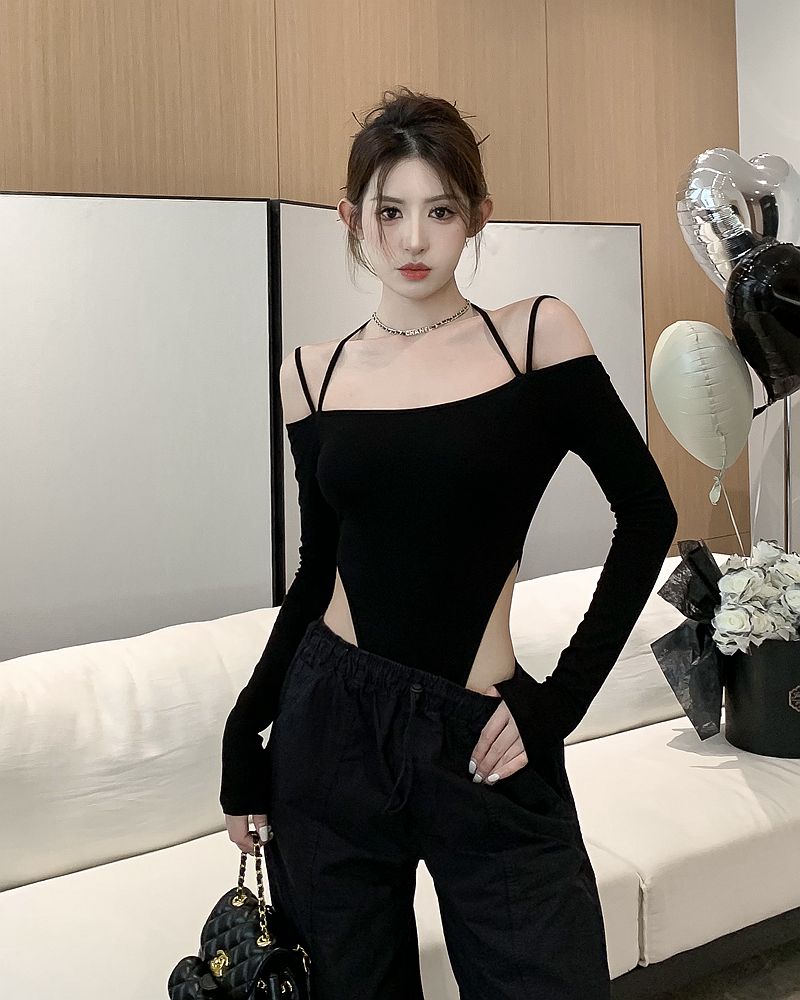 Xia Chun 섹시한 뜨거운 여자 스타일 고삐 목을 어깨 불규칙한 긴 소매 티셔츠 검은 점프 슈트 탑