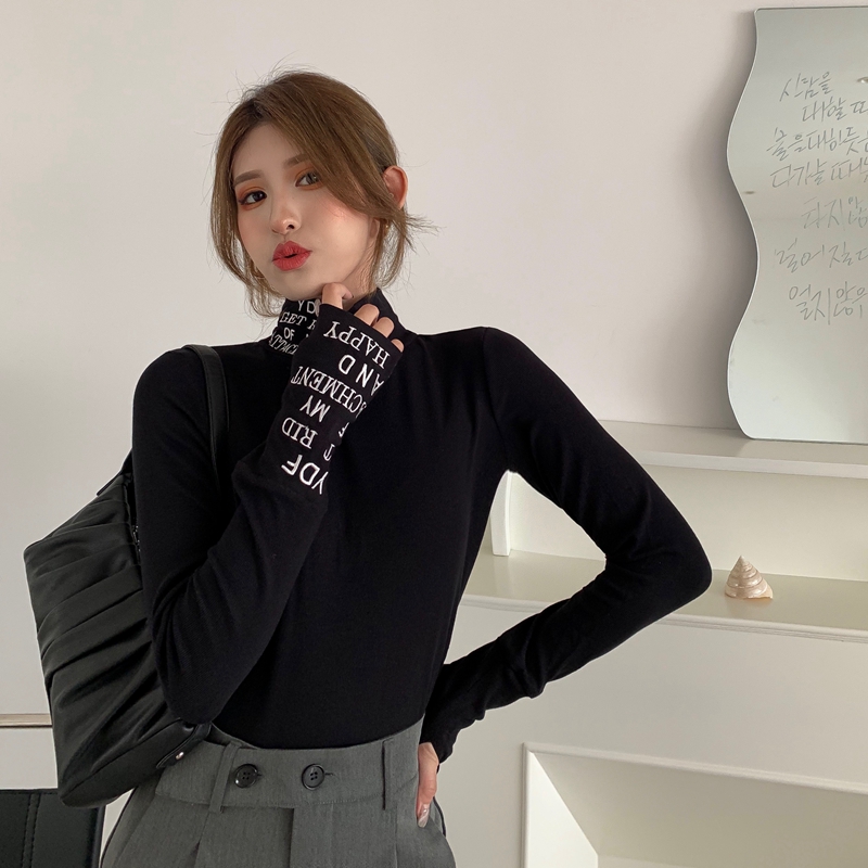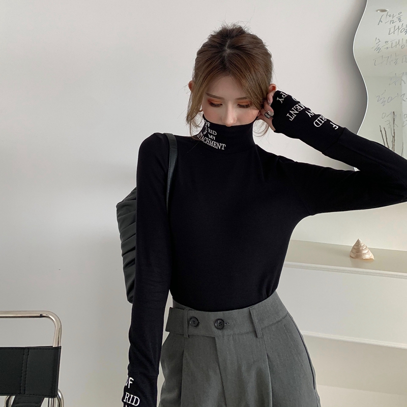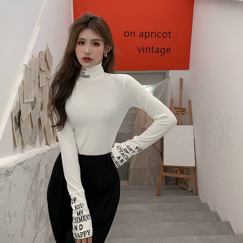 실제 홍콩 스타일 레트로 자수 편지 남성면 실 슬림 하이 그라미 넥 소매 티셔츠베이스 셔츠