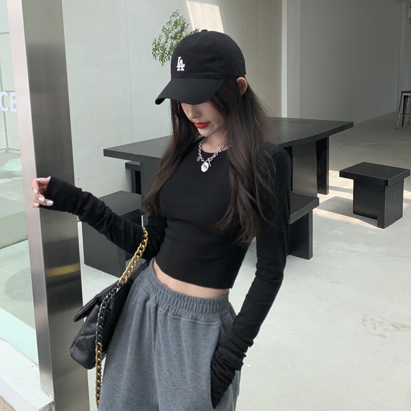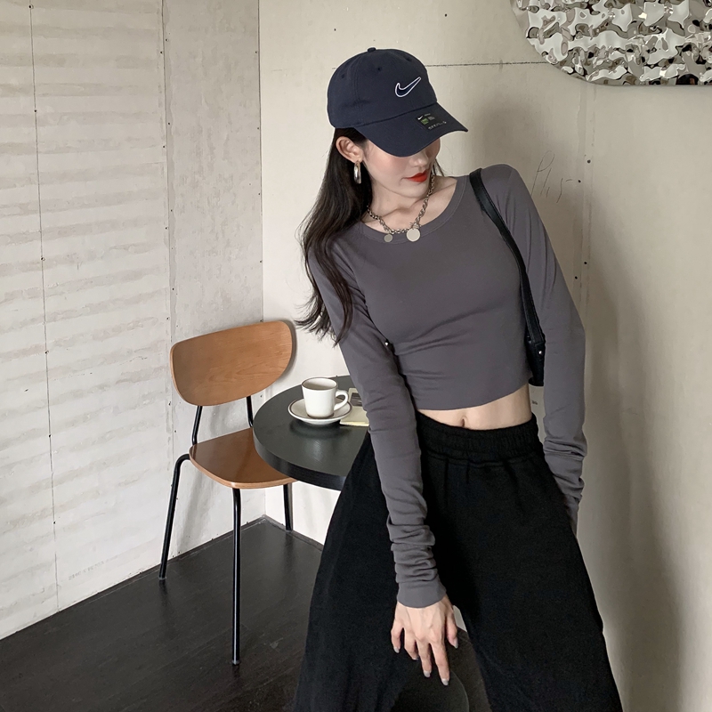 실제 홍콩 스타일의 핫 걸 스타일 슬림 안에 긴 슬리브베이스 셔츠 단색 짧은 티셔츠 여자 높은 허리 배꼽 탑 트렌디