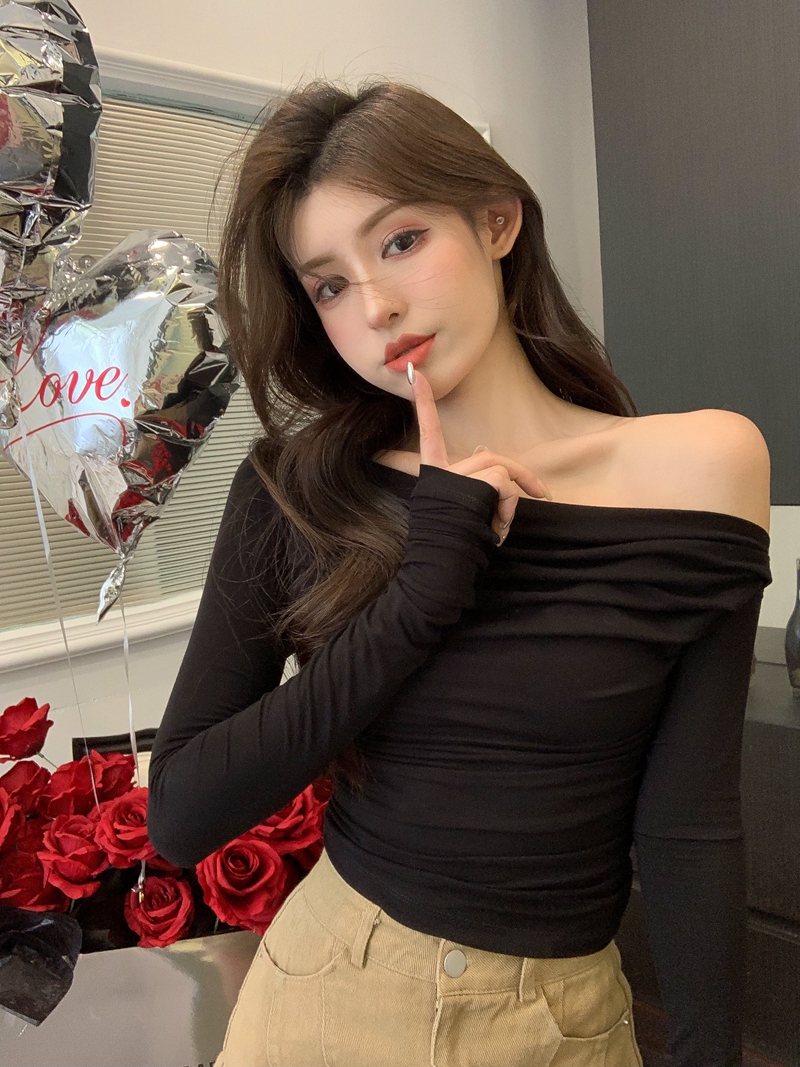 이른 가을 홍콩 스타일의 핫 걸 스타일 쇄골 킬러 킬러 비대칭 경사 목 스웨터 여성 얇은 긴팔 티셔츠 탑