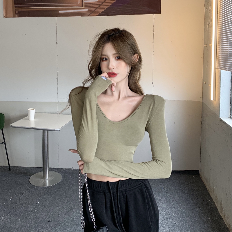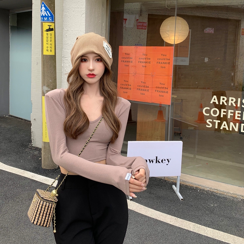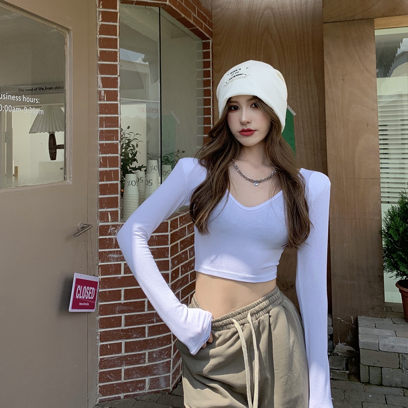 실제 홍콩 스타일 허리가 많은 여성을위한 거대하고 편안한 배꼽에 노출 된 꽉 u-넥 긴팔 티셔츠가 높습니다.