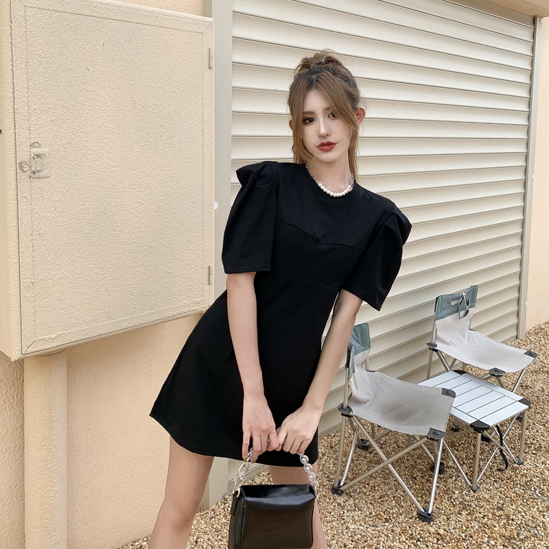 새로운 홍콩 스타일의 레트로 허리 껴안기와 슬리밍 및 세련된 퍼프 슬리브 티셔츠 치마 insh-waist 니트 드레스의 진짜 샷