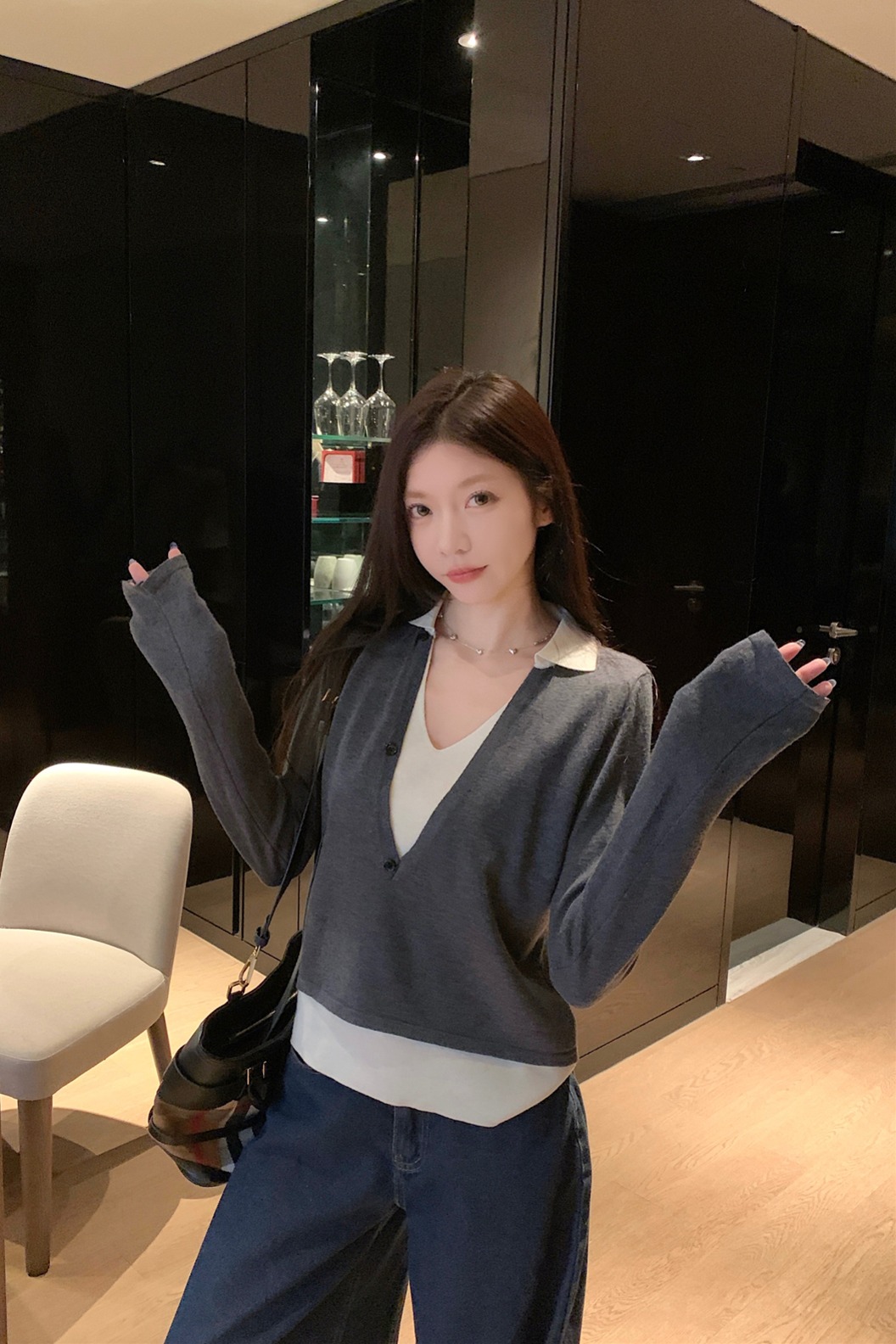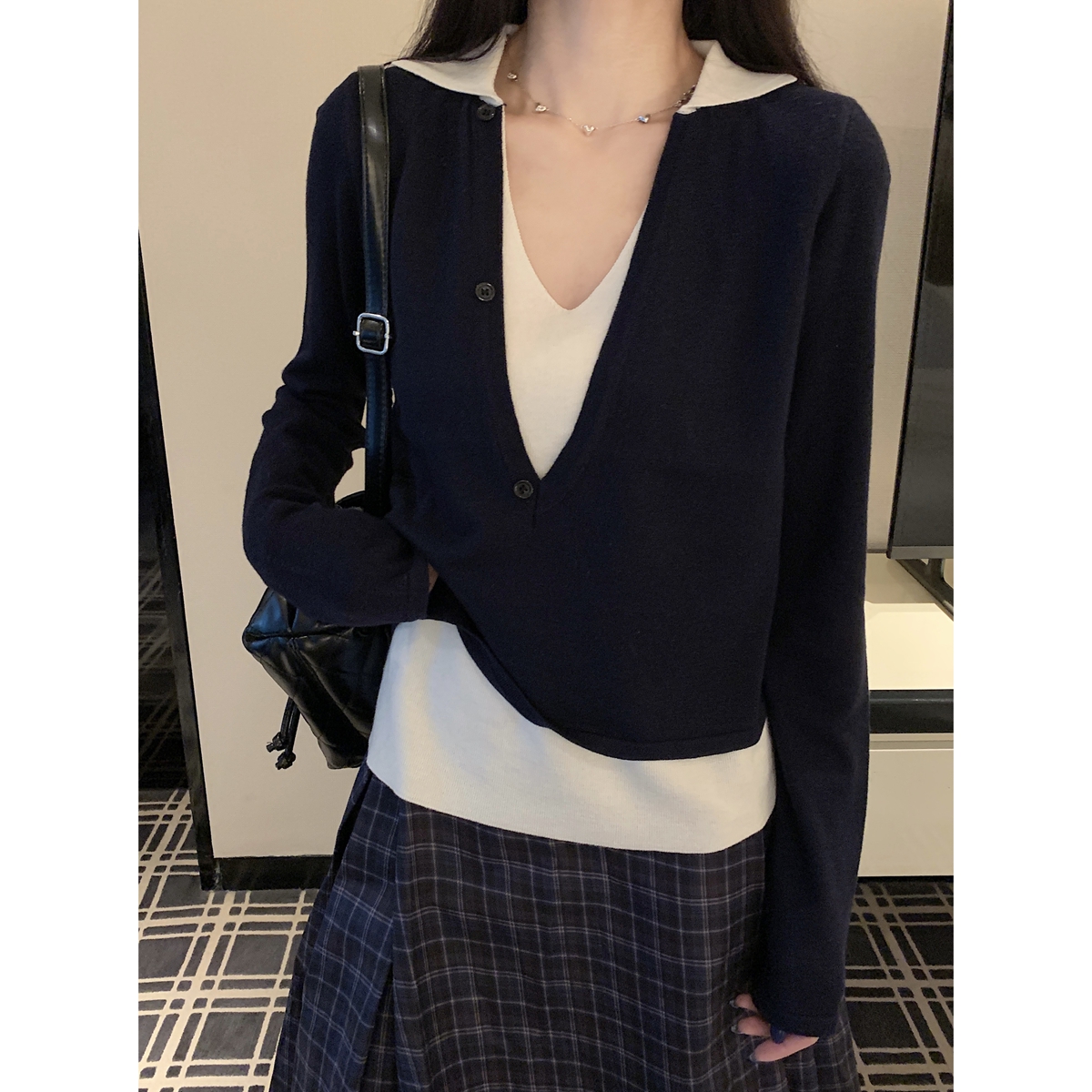 실제 사진과 실제 가격. 이른 가을의 새로운 한국 버전의 이른 가짜 가짜 2 피스 라펠 스웨터 슬림 긴 소매 및 여성용 다목적 기질 상단