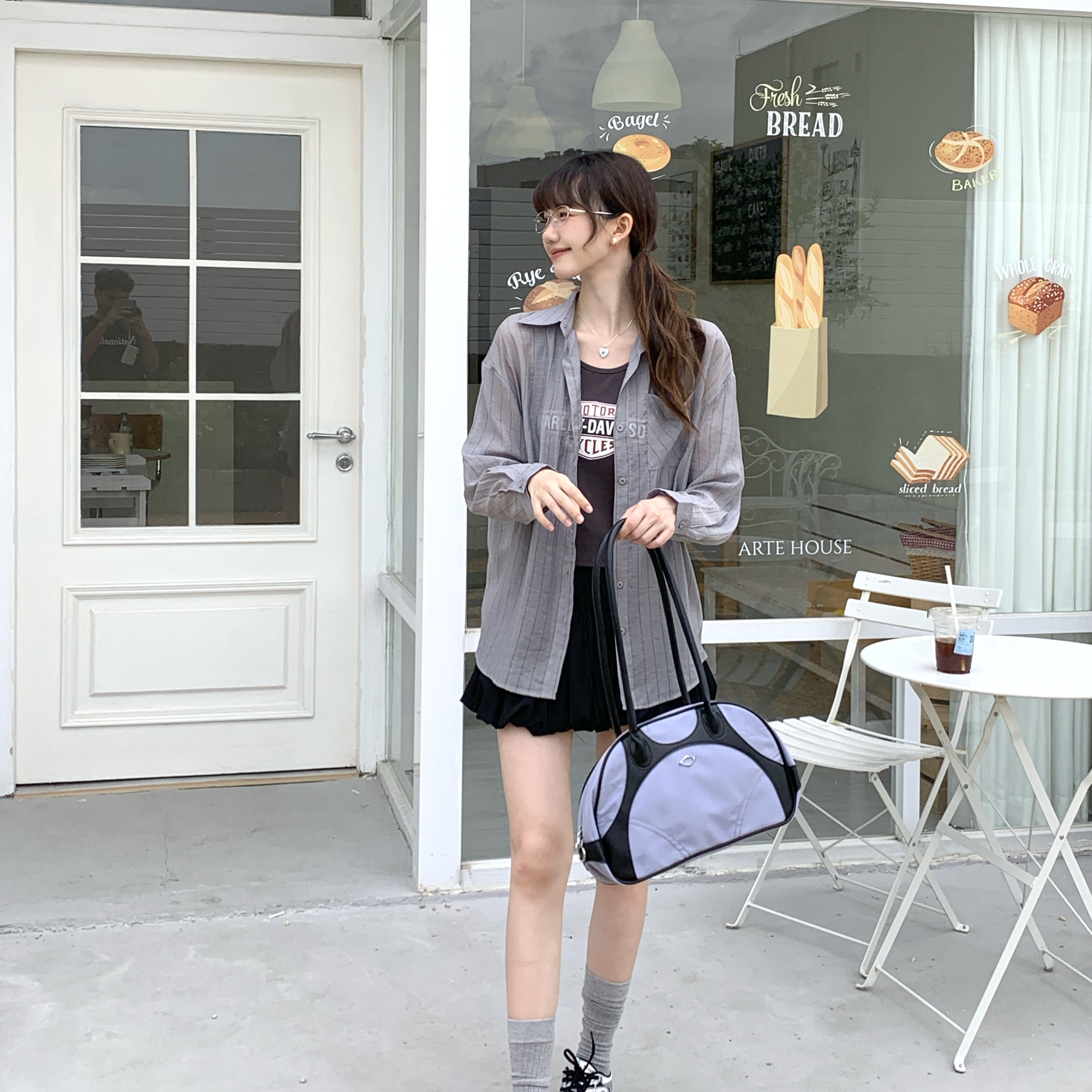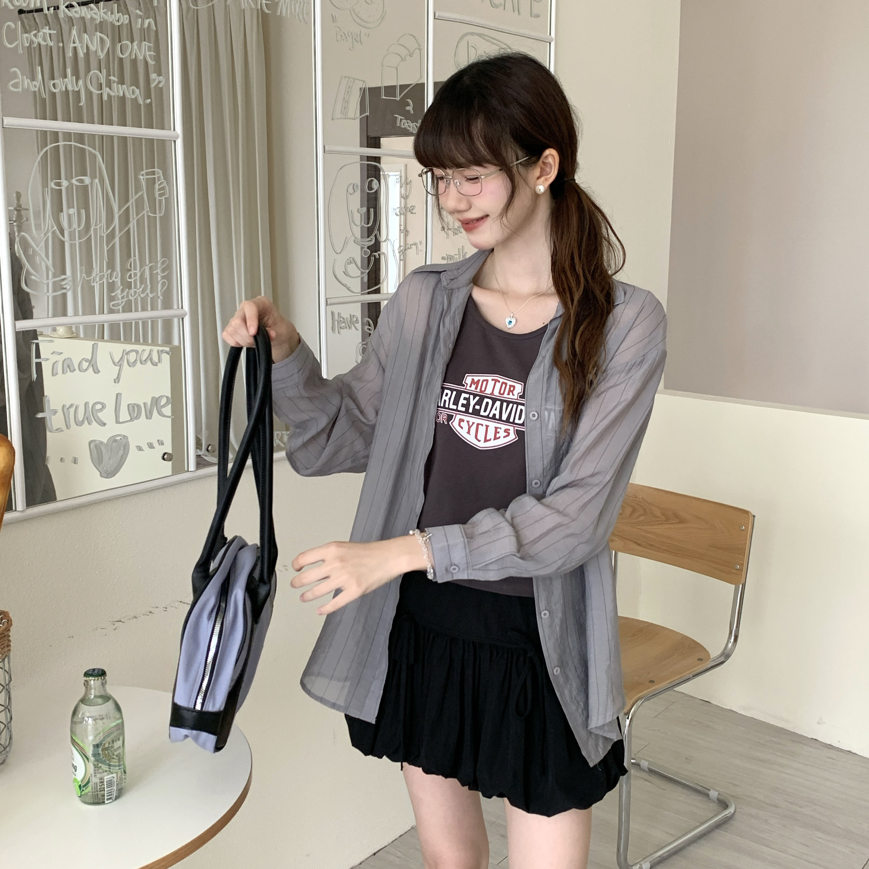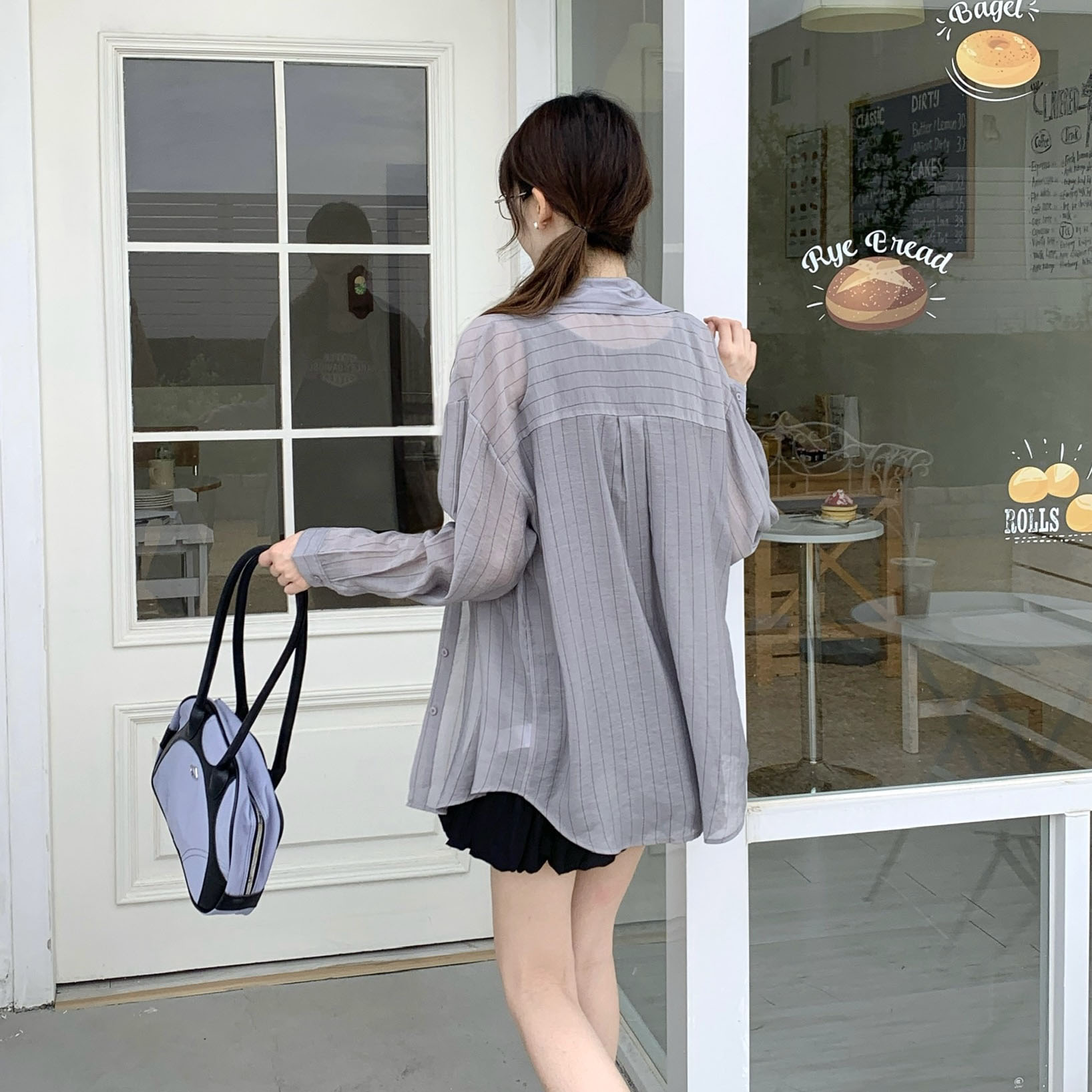 실제 가격#폴로 칼라 스트라이프 선 스크린 여성용 긴팔 셔츠 202 셔츠 인쇄 서스펜더 조끼 2 피스 세트